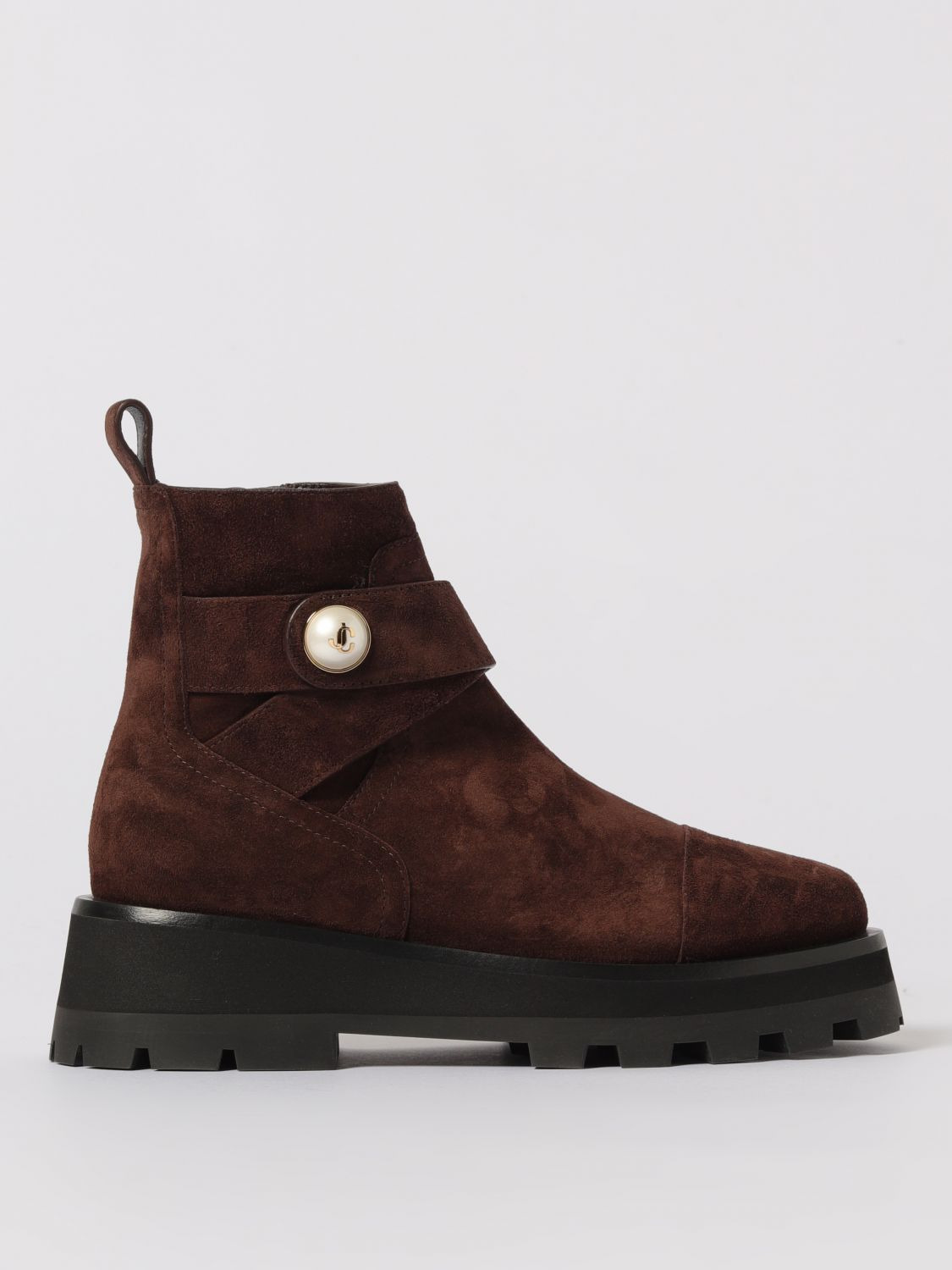 DESCRIPTION - Logo: Metallic - Details: Synthetic pearls - Lining: With logo - Model: Slip on - Closure: Side closure with zip - Toe: Round - Shaft: Low - Sole: Rubber - Heel: Low heel - Materials: Suede calfskin - Pattern: Plain-colored DETAILS AND CARE Composition 100% CALF SIZE AND FIT Sizes not available Designer code: MEENAFLATSVV CHOCOLATE Giglio Code: H37056 Designer: Jimmy Choo Collection: Jimmy Choo Woman Category: Shoes Jimmy Choo