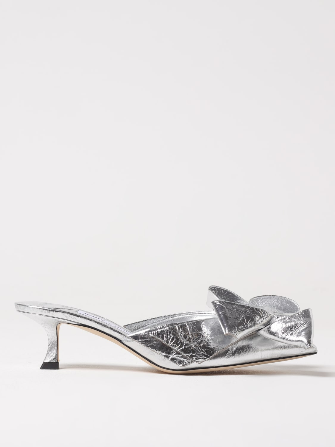 DESCRIPTION - Style: Romantic - Details: With bow - Toe: Tapered - Heel: Open, undefined - Sole: Leather and rubber - Materials: Brushed leather - Pattern: Plain-colored DETAILS AND CARE Composition not available SIZE AND FIT Sizes Heel: 5 cm Designer code: STAZMULE50GWG SILVER/SILVER Giglio Code: G50345 Designer: Jimmy Choo Collection: Jimmy Choo Woman Category: Shoes Jimmy Choo