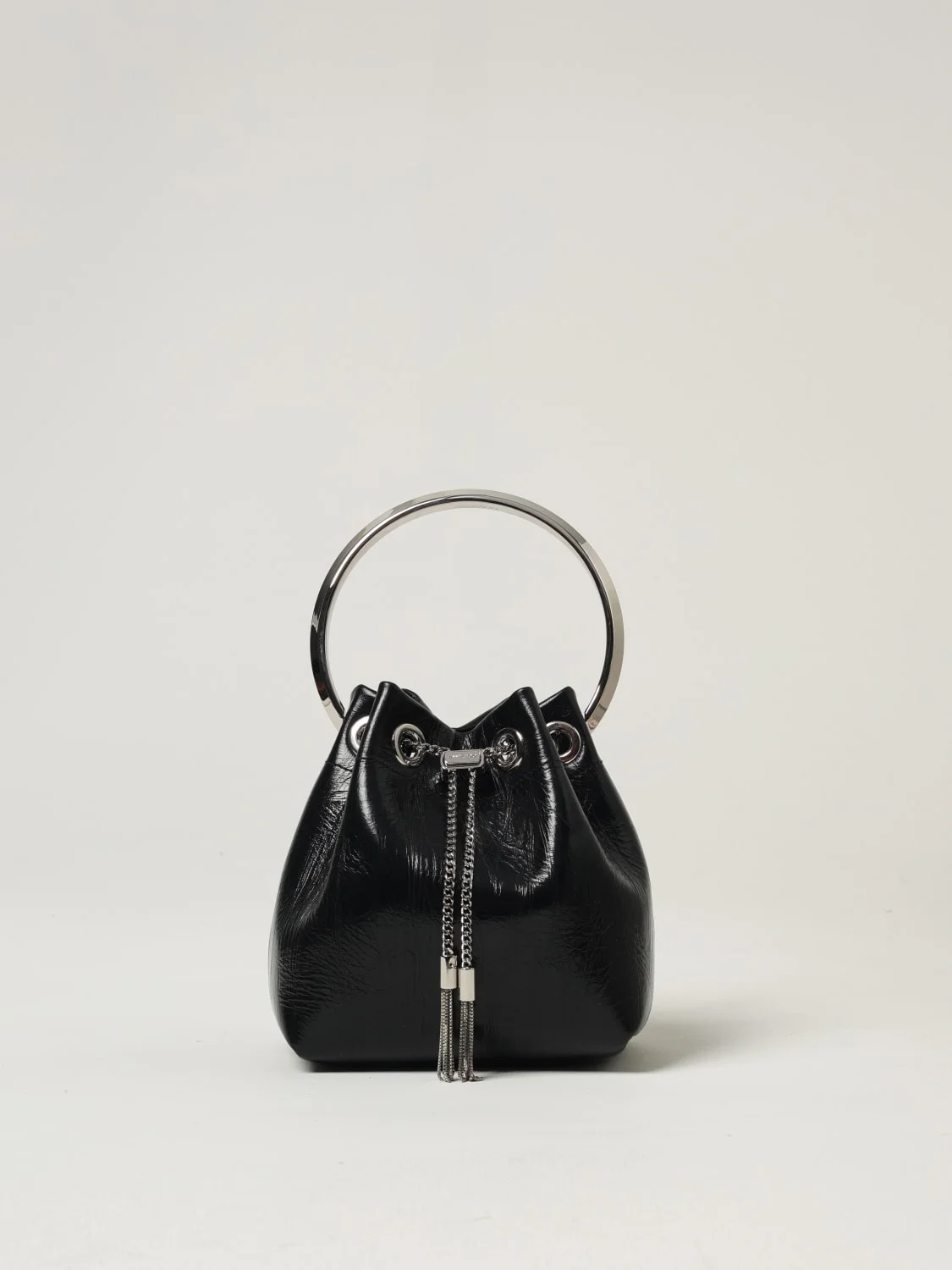 DESCRIPTION - Style: Rock - Logo: Engraved - Details: With pearls - Model: Bucket - Closure: With drawstrings - Handle: Rigid - Shoulder strap: Metal mesh - Shape: Round - Materials: Leather - Pattern: Plain-colored DETAILS AND CARE Composition 100 AF SIZE AND FIT Sizes not available Designer code: BONBONTZZ BLACK SILVER Giglio Code: 432201 Designer: Jimmy Choo Collection: Jimmy Choo Woman Category: Bags Jimmy Choo