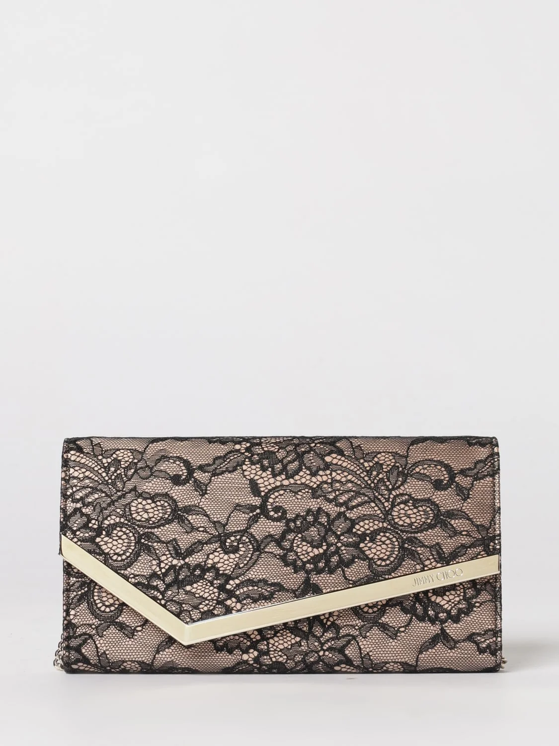 DESCRIPTION - Style: Elegant - Occasion: Ceremony and cocktail, Evening and party - Logo: Engraved, Lettering - Lining: With 6 card slots, With zip pocket - Model: Hand - Shape: Rectangular - Shoulder strap: Metal mesh, Removable - Closure: With flap and magnetic buttons - Materials: Lace - Pattern: Embroidery, Floral DETAILS AND CARE Composition 100% fabric SIZE AND FIT Sizes Width : 22 cm Height: 12 cm Depth: 3 cm Designer code: EMMIEJXO BLACK/BALLET PINK/LIGHT GOL Giglio Code: H82737 Designer: Jimmy Choo Collection: Jimmy Choo Woman Category: Bags Jimmy Choo