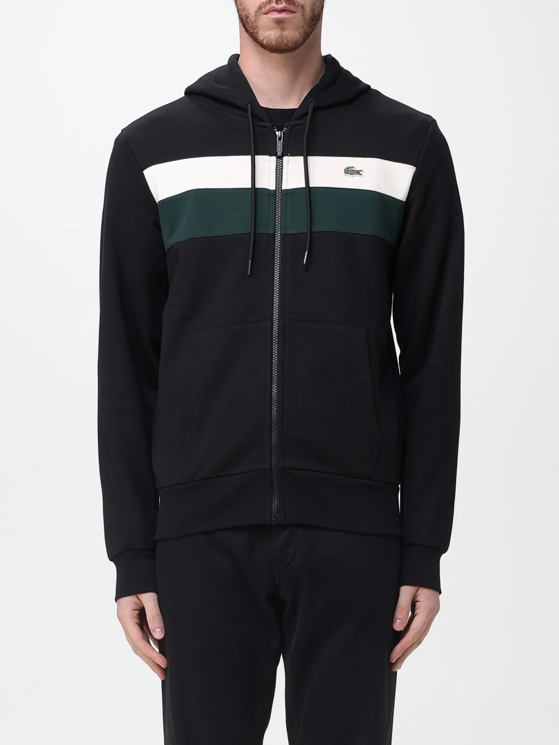 DESCRIPTION - Style: Casual, Sporty - Logo: Contrasting - Hood: With drawstrings - Shoulders: Regular - Sleeves: Long - Closure: With zip - Pockets: America - Bottom: With straight hemline - Model: With hood - Materials: Cotton blend - Pattern: Logo, Stripes DETAILS AND CARE Composition not available SIZE AND FIT Sizes not available Size and fit Regular fit Designer code: SH5913 6XH Giglio Code: H63352 Designer: Lacoste Collection: Lacoste Men Category: Clothing Lacoste