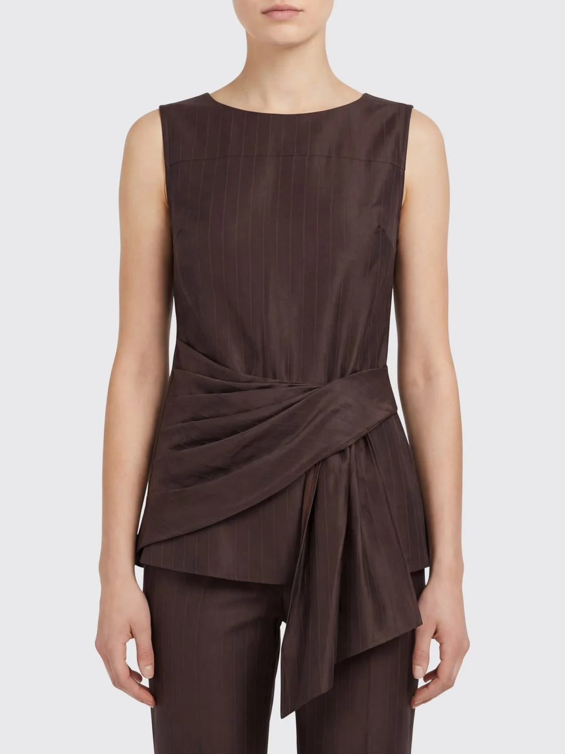 DESCRIPTION - Style: Elegant, Minimal - Model: Draped - Neckline: Crewneck - Shoulders: Regular - Closure: Back closure with zip - Waist: Draped - Bottom: With straight hemline - Sleeves: Off-the-shoulder tops - Materials: Silk blend - Pattern: Plain-colored DETAILS AND CARE Composition | 46% SILK 54% VISCOSE SIZE AND FIT Sizes not available Size and fit Slim fit Designer code: FONDA DARK BROWN Giglio Code: H81933 Designer: Loulou De Saison Collection: Clothing Loulou De Saison Category: Clothing > Top