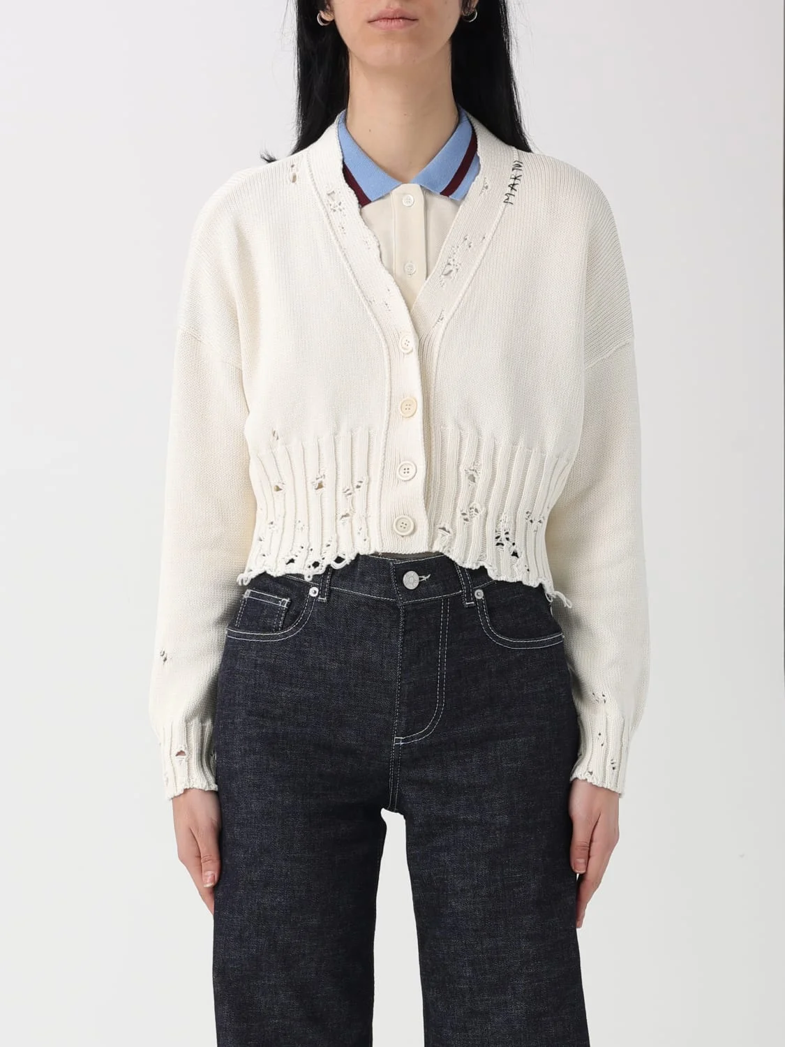 DESCRIPTION - Style: Casual, Urban-street - Neckline: V neckline - Shoulders: Regular - Sleeves: Long - Closure: With buttons - Bottom: With straight hemline - Model: Usured effect - Materials: Cotton - Pattern: Plain-colored DETAILS AND CARE Composition Prim. Fabric: 100% CO Knit SIZE AND FIT Sizes not available Size and fit Regular fit Designer code: CDMD0223A2UFC652 00W01 Giglio Code: H90641 Designer: Marni Collection: Marni Woman Category: Clothing Marni