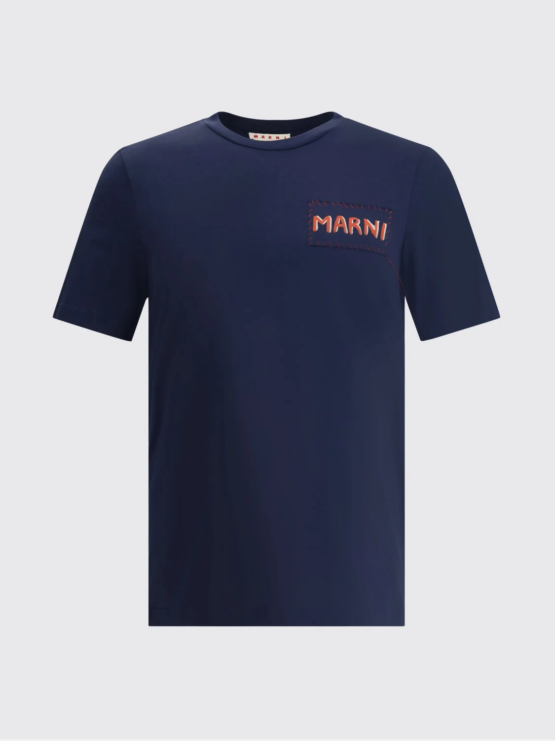 DESCRIPTION - Style: Sporty - Logo: Contrasting - Model: Crewneck - Neckline: Crewneck - Shoulders: Regular - Sleeves: Short - Bottom: With straight hemline - Materials: Stretch cotton - Pattern: Logo DETAILS AND CARE Composition GENERAL COTTON 100 - SIZE AND FIT Sizes not available Size and fit Slim fit Designer code: HUMU0198X0UTC446 00B99 Giglio Code: H18610 Designer: Marni Collection: Marni Men Category: Clothing Marni