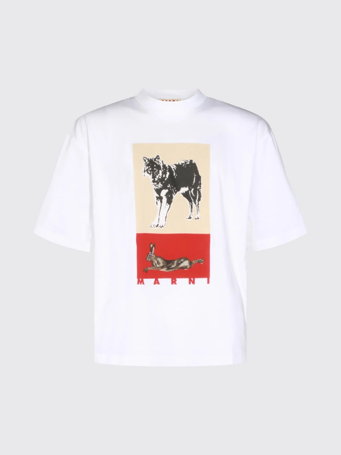 DESCRIPTION - Style: Casual, Urban-street - Logo: Contrasting - Model: Crewneck - Neckline: Crewneck - Shoulders: Regular - Sleeves: Short - Bottom: With straight hemline - Materials: Cotton - Pattern: Graphic DETAILS AND CARE Composition _100 % CO SIZE AND FIT Sizes not available Size and fit Regular fit Designer code: HUMU0223VPUSCY48 PRW01 Giglio Code: H76118 Designer: Marni Collection: Marni Men Category: Clothing Marni