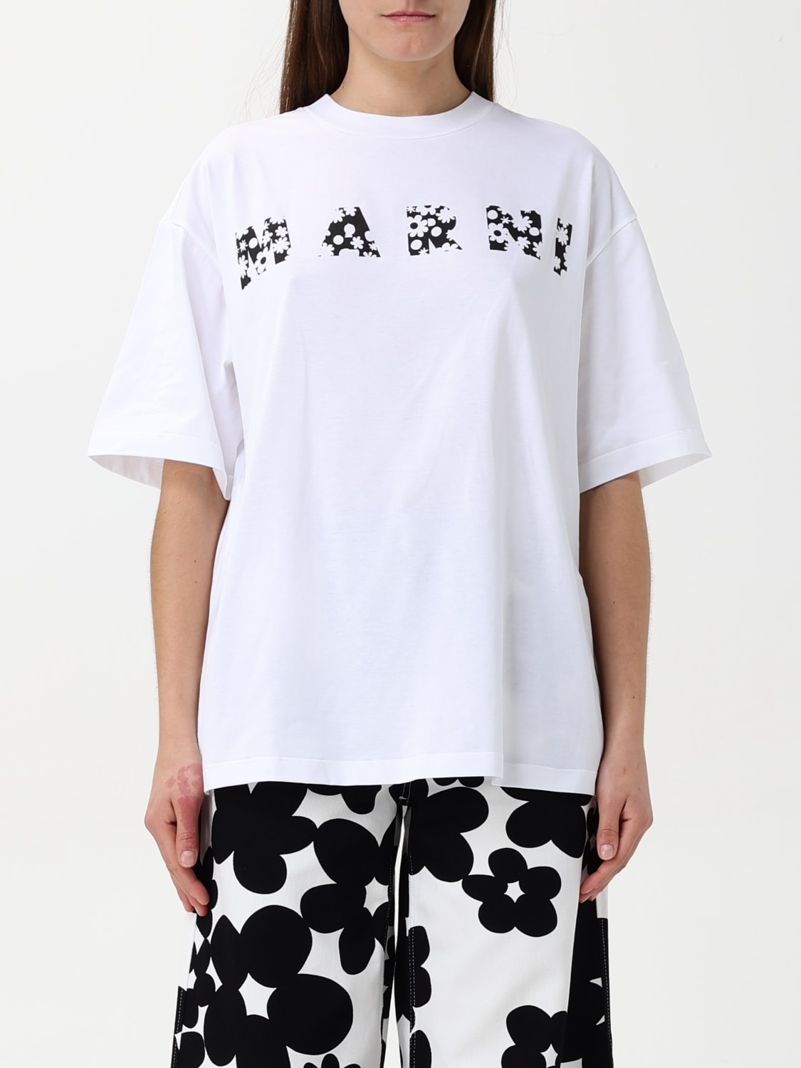 DESCRIPTION - Style: Urban-street - Occasion: Day - Logo: Contrasting - Neckline: Crewneck - Shoulders: Relaxed - Sleeves: Short - Bottom: With straight hemline - Materials: Cotton - Pattern: Plain-colored, All-over logo DETAILS AND CARE Composition Primary Fabric: 100% Cotton Knit SIZE AND FIT Sizes not available Size and fit Relaxed fit Designer code: THJET49P15USCX50 FLW01 Giglio Code: 427691 Designer: Marni Collection: Marni Woman Category: Clothing Marni