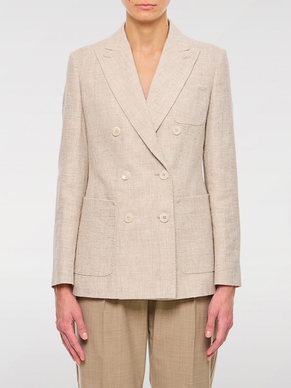DESCRIPTION - Style: Classic, Elegant - Model: Double-breasted - Neck: Lapel - Shoulders: Padded, Regular - Sleeves: Long - Closure: With buttons - Pockets: Patch pocket - Bottom: With straight hemline, With back slit - Materials: Silk blend, Wool blend - Pattern: Plain-colored DETAILS AND CARE Composition 44% LI 25% WO 17% PA 14% SE SIZE AND FIT Sizes not available Size and fit Regular fit Designer code: 2511041181600 001 Giglio Code: G57983 Designer: Max Mara Collection: Max Mara Woman Category: Clothing Max Mara