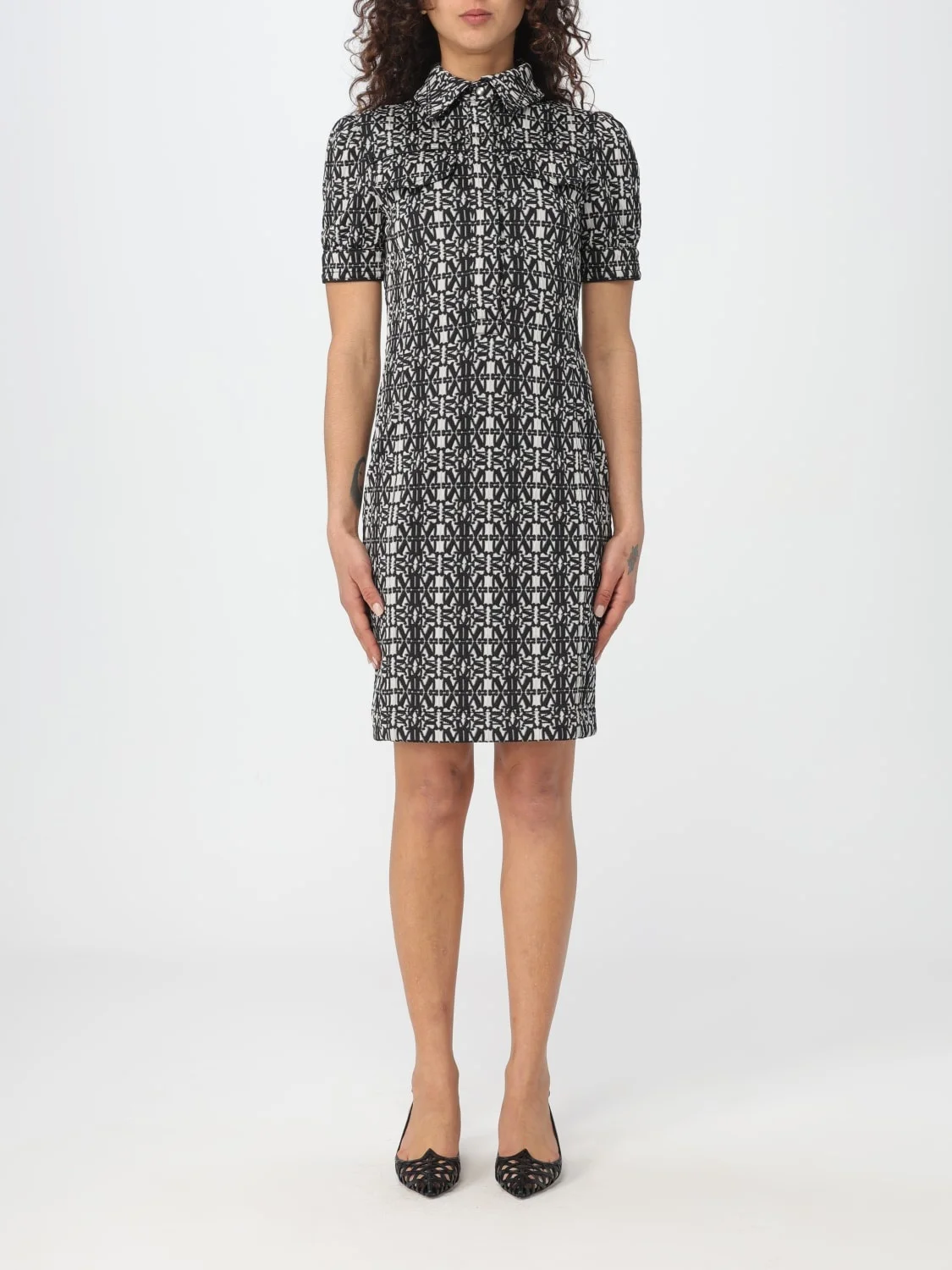 DESCRIPTION - Style: Chic, Elegant - Model: Chemisier - Neck: Classic - Shoulders: Regular - Closure: Concealed buttons - Bottom: With straight hemline - Length: Mini dresses - Occasion: Evening and party dresses, Morning dresses - Sleeves: Kurzarmlige Kleider - Materials: Jersey - Pattern: Monogram DETAILS AND CARE Composition 84% Polyester, 11% Polyamide, 05% Elasta SIZE AND FIT Sizes not available Size and fit Slim fit Designer code: 2411621022600 001 Giglio Code: 402352 Designer: Max Mara Collection: Max Mara Woman Category: Clothing Max Mara