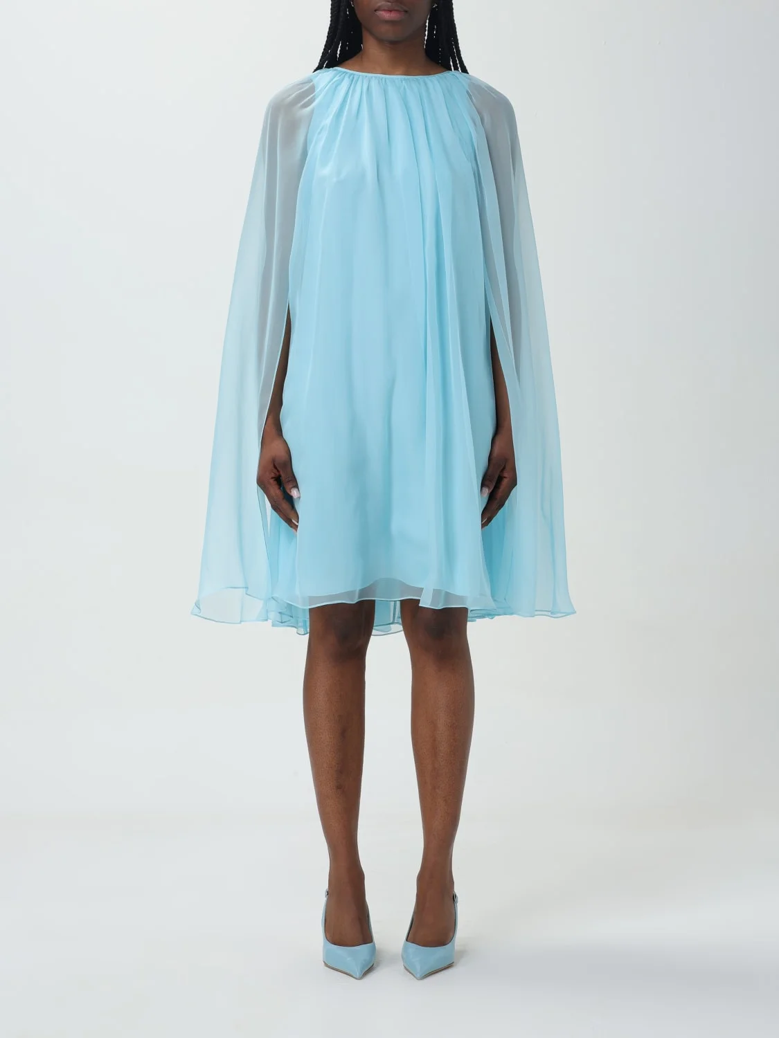 sheer-overlay silk cape dress