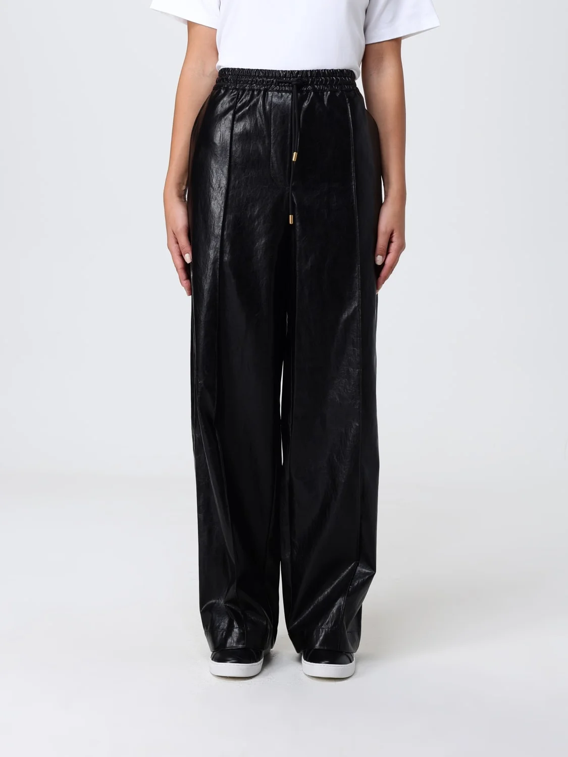 DESCRIPTION - Style: Casual, Sporty - Model: Jogging - Pockets: Slit pocket - Waist: High waist - Bottom: With straight hemline - Materials: Synthetic leather - Pattern: Plain-colored DETAILS AND CARE Composition 75% Viscosa 14% Poliestere 7% Cotone 4% Metal SIZE AND FIT Sizes not available Size and fit Straight leg Designer code: MT530UPDTW 001 Giglio Code: H38656 Designer: Michael Kors Collection: Clothing Michael Kors Category: Clothing > Pants