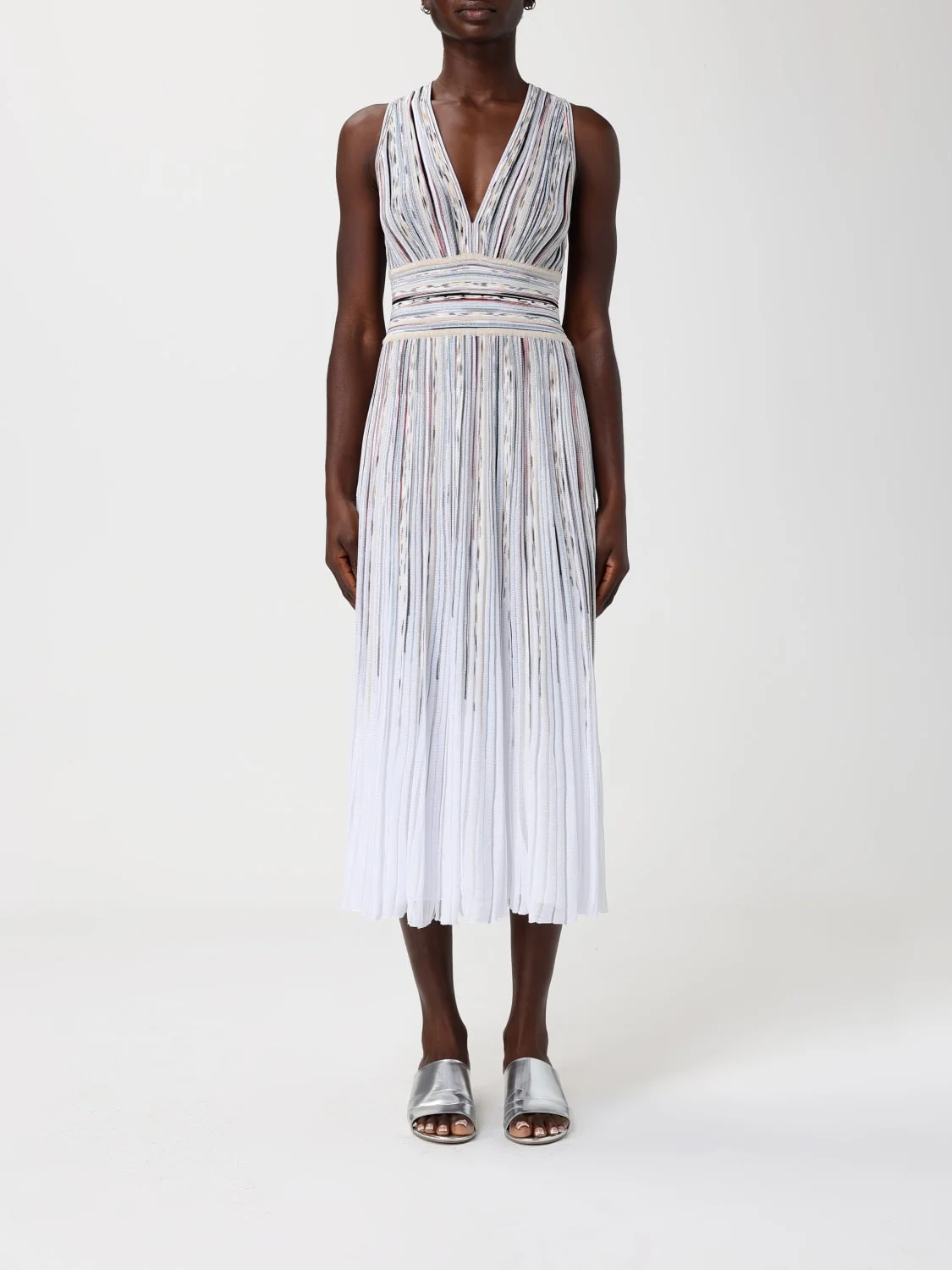 DESCRIPTION - Style: Classic - Model: Pleated - Neckline: V neckline - Shoulders: Regular - Bottom: With straight hemline - Length: Midi dresses - Occasion: Morning dresses - Sleeves: Off-the-shoulder dresses - Materials: Stretch viscose jersey - Pattern: Multicolor stripes DETAILS AND CARE Composition 88%VI 5%ME 5%PL 1%EA 1%PA SIZE AND FIT Sizes not available Size and fit Regular fit Designer code: DS26SG13BK01GZ SM9ZZ Giglio Code: 441711 Designer: Missoni Collection: Clothing Missoni Category: Clothing > Dress