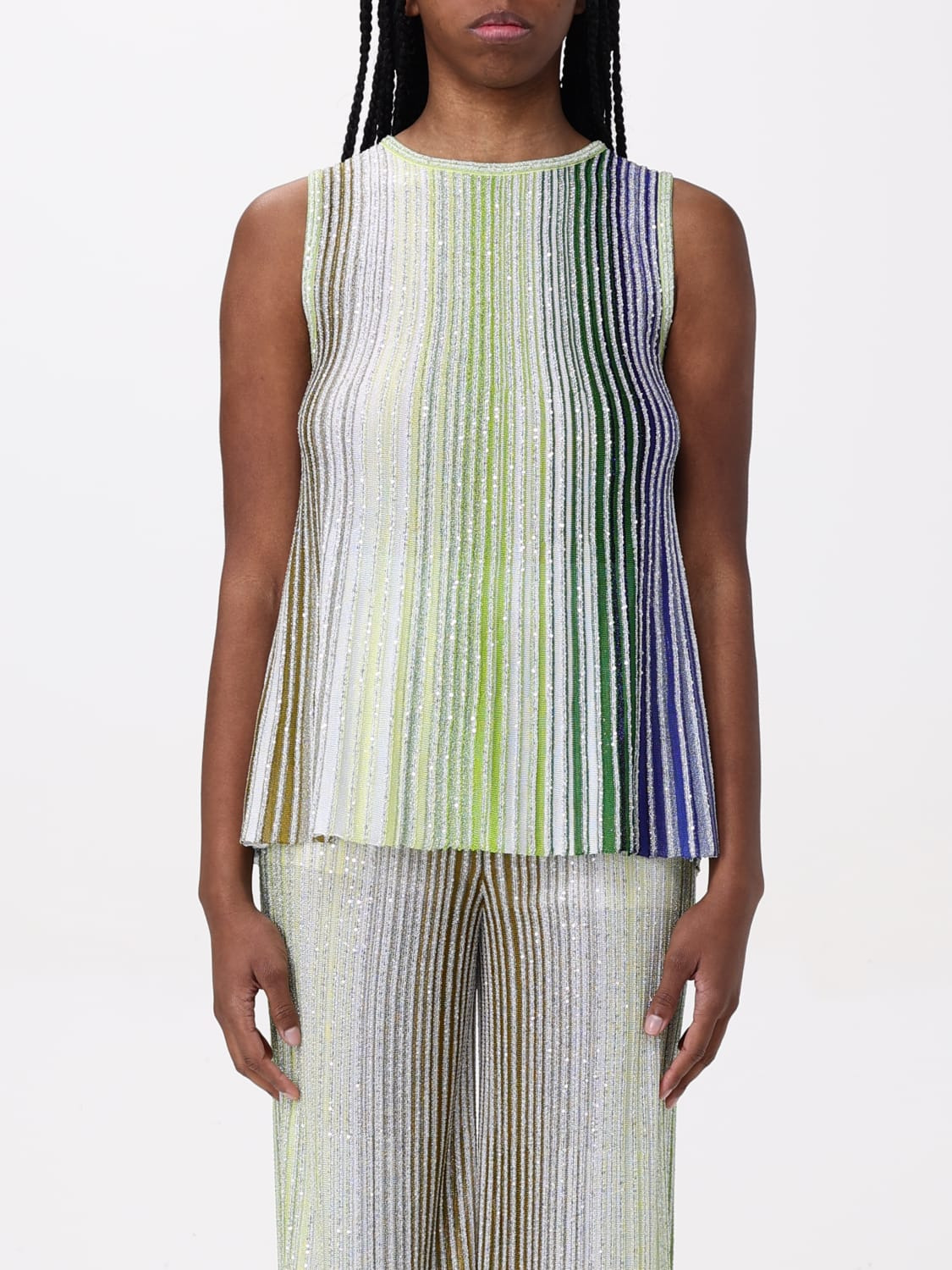 DESCRIPTION - Style: Classic - Neckline: Round - Shoulders: Regular - Sleeves: Sleeveless tops - Bottom: With straight hemline - Materials: Viscose , Lurex - Pattern: Stripes DETAILS AND CARE Composition 80% VISCOSA 8% POLIAMMIDE 6% METALLO 6% POLIE SIZE AND FIT Sizes not available Size and fit Slim fit Designer code: DS25SK0UBK042D SM9N9 Giglio Code: G57506 Designer: Missoni Collection: Missoni Woman Category: Clothing Missoni