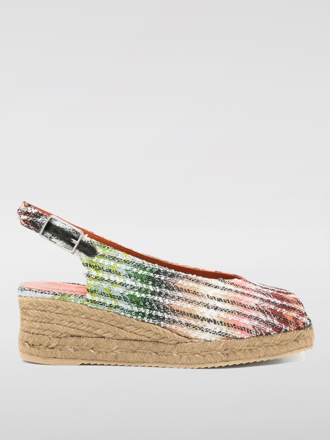 DESCRIPTION - Lining: Jute midsole, Leather, With logo - Model: Slingback - Toe: Open, Round - Heel: With adjustable strap - Sole: Rubber - Heel: Medium - Materials: Viscose - Pattern: Multicolor waves DETAILS AND CARE Composition Viscose | 47% VISCOSE 26% POLYAMIDE 20% POLYE SIZE AND FIT Sizes Heel: 6 cm Designer code: MWB009080 RAINBOW Giglio Code: G71080 Designer: Missoni Collection: Missoni Woman Category: Shoes Missoni