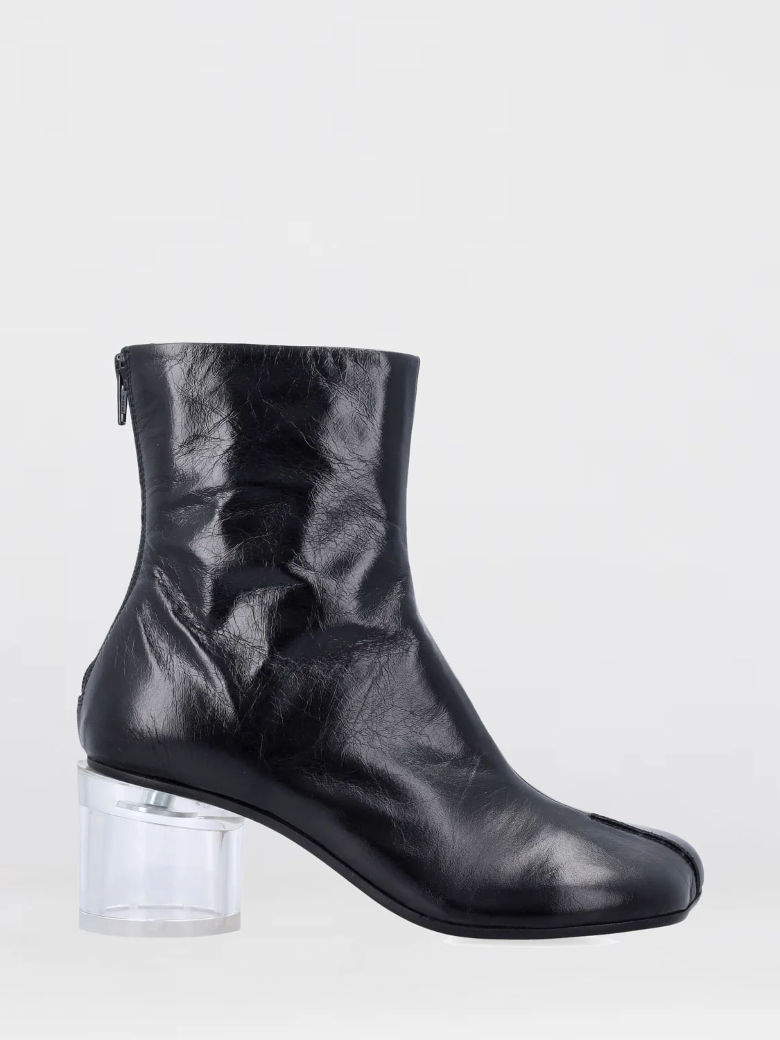 DESCRIPTION - Style: Contemporary - Lining: Leather, With logo - Closure: Back closure with zip - Shaft: Low - Sole: Leather - Toe: Asymmetric, Round - Occasion: Morning - Heel: Tacco cilindrico medio - Materials: Smooth cowhide - Pattern: Plain-colored - Model: Ankle boots DETAILS AND CARE Composition Upper 100% bovine leather Lining 100% bovine SIZE AND FIT Sizes not available Designer code: S59WU0265P7560 T8013 Giglio Code: H90071 Designer: Mm6 Maison Margiela Collection: Mm6 Maison Margiela Woman Category: Shoes Mm6 Maison Margiela