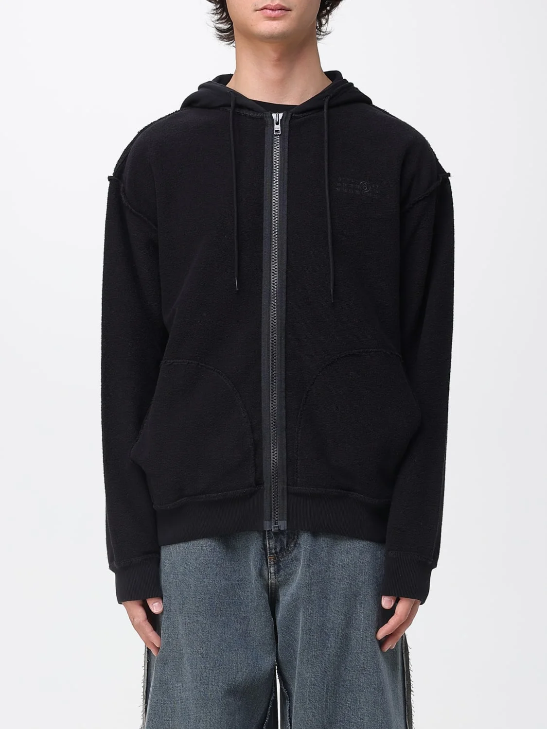 DESCRIPTION - Style: Contemporary, Sporty - Hood: With drawstrings - Shoulders: Relaxed - Sleeves: Long - Cuffs: Stretch - Closure: With zip - Pockets: Patch pocket - Bottom: Stretch - Model: With hood - Materials: Cotton - Pattern: Plain-colored DETAILS AND CARE Composition 100% COTTON SIZE AND FIT Sizes not available Size and fit Regular fit Designer code: SH0GU0029M25014 900 Giglio Code: H34574 Designer: Mm6 Maison Margiela Collection: Mm6 Maison Margiela Men Category: Clothing Mm6 Maison Margiela