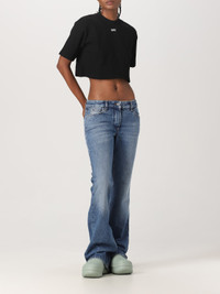 DESCRIPTION - Style: Casual - Pockets: 5-pocket - Waist: Low waist - Bottom: With straight hemline - Closure: With button and zip - Materials: Stretch denim - Pattern: Plain-colored DETAILS AND CARE Composition 100% COTTON SIZE AND FIT Sizes not available Size and fit Flared, Slim fit Designer code: OWYA061F23DEN001 4500 Giglio Code: 393230 Designer: Off-White Collection: Off-White Woman Category: Clothing Off-White