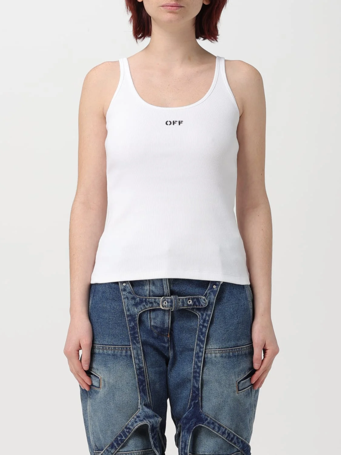DESCRIPTION - Style: Sporty - Logo: Embroidered - Shoulders: Regular, With thin shoulder straps - Sleeves: Sleeveless - Bottom: With straight hemline - Neckline: Round - Materials: Cotton - Pattern: Plain-colored DETAILS AND CARE Composition 98% cotton, 2% elastane SIZE AND FIT Sizes not available Size and fit Slim fit Designer code: OWAD072C99JER002 0110 Giglio Code: F27305 Designer: Off-White Collection: Off-White Woman Category: Clothing Off-White