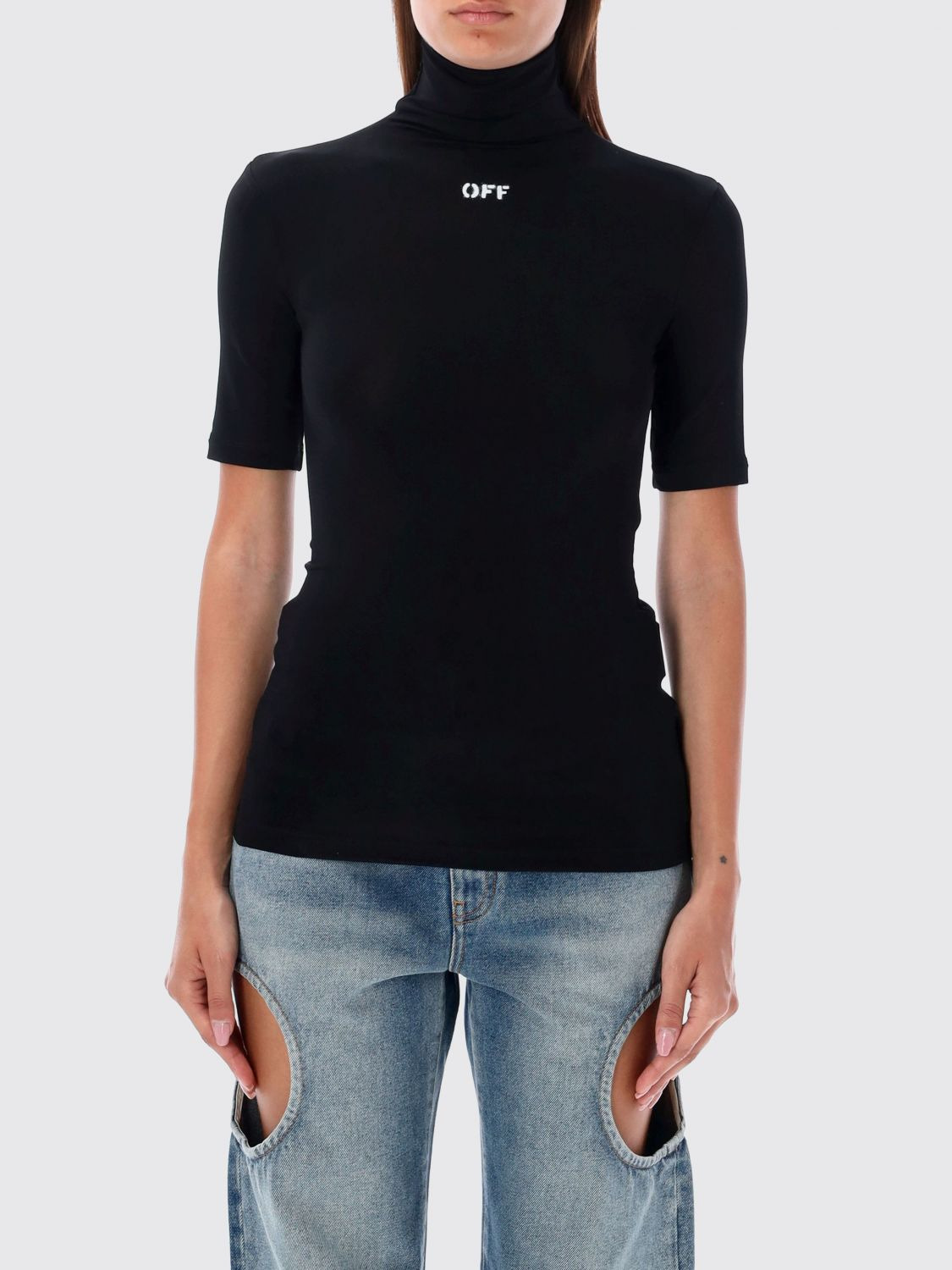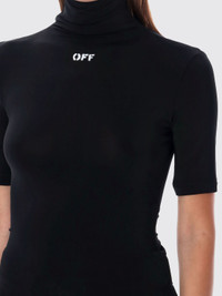 DESCRIPTION - Style: Casual - Logo: Lettering - Neck: Turtleneck - Shoulders: Regular - Bottom: With straight hemline - Sleeves: Short sleeve tops - Materials: Stretch viscose - Pattern: Logo DETAILS AND CARE Composition 95% viscose 5% elastane SIZE AND FIT Sizes not available Size and fit Regular fit Designer code: OWAD137C99JER002 1001 Giglio Code: H42919 Designer: Off-White Collection: Off-White Woman Category: Clothing Off-White