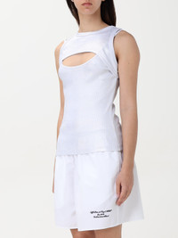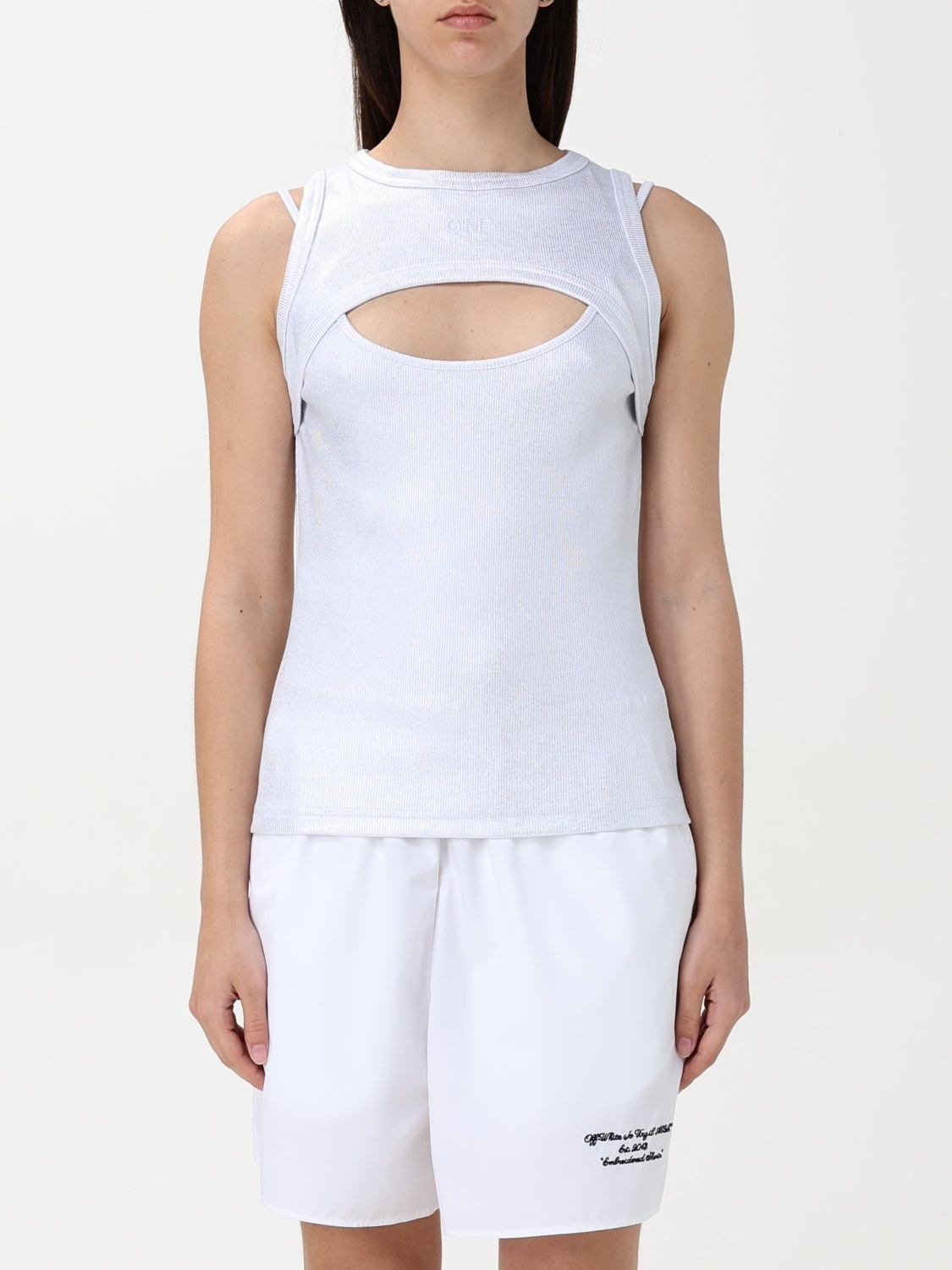 DESCRIPTION - Style: Contemporary - Model: Cut-out, Ribbed - Neckline: Crewneck - Shoulders: With thin shoulder straps - Sleeves: Sleeveless tops - Bottom: With straight hemline - Materials: Cotton - Pattern: Plain-colored DETAILS AND CARE Composition 98% Cotton 2% Elastane SIZE AND FIT Sizes not available Size and fit Slim fit Designer code: OWAD237S25JER001 7201 Giglio Code: G70064 Designer: Off-White Collection: Off-White Woman Category: Clothing Off-White