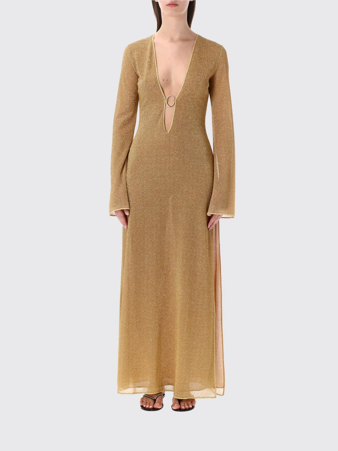 DESCRIPTION - Style: Vintage - Neckline: V neckline - Shoulders: Regular - Closure: Absent - Bottom: With straight hemline - Details: With metallic ring - Length: Long dresses - Occasion: Beach dresses - Sleeves: Long sleeve dresses - Materials: Lurex - Pattern: Plain-colored DETAILS AND CARE Composition GENERAL POLYAMIDE 64 - GENERAL OTHER FIBRES 3 SIZE AND FIT Sizes not available Size and fit Regular fit Designer code: RLS261 GOLD Giglio Code: H86794 Designer: Oseree Collection: Clothing Oseree Category: Clothing > Dress