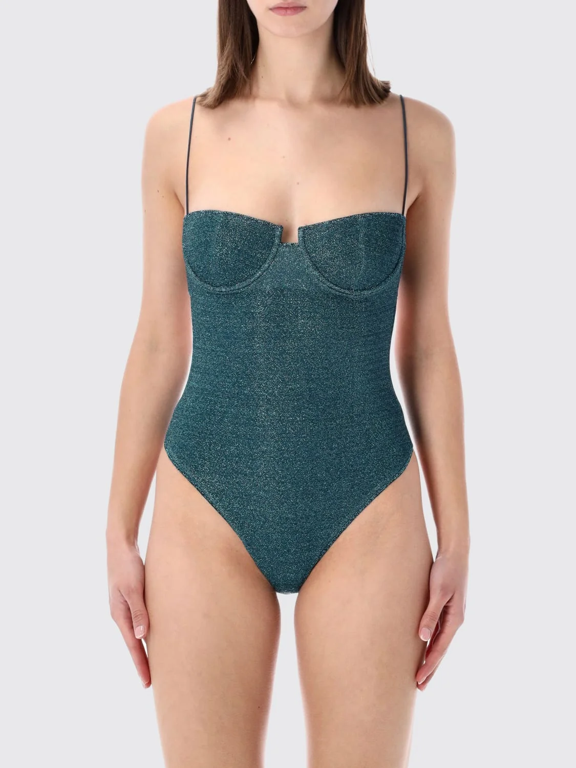 DESCRIPTION - Style: Glamour - Model: One-piece, Stretch - Neckline: Straight - Shoulders: With thin shoulder straps - Closure: Back closure with laces - Bottom: With straight hemline - Materials: Lurex, Polyamide - Pattern: Plain-colored DETAILS AND CARE Composition 64% POLYAMIDE 36% METALLIC 86% POLYAMIDE 14% SIZE AND FIT Sizes not available Size and fit Slim fit Designer code: LSS261 PEACOCK Giglio Code: H94109 Designer: Oseree Collection: Oseree Woman Category: Clothing Oseree