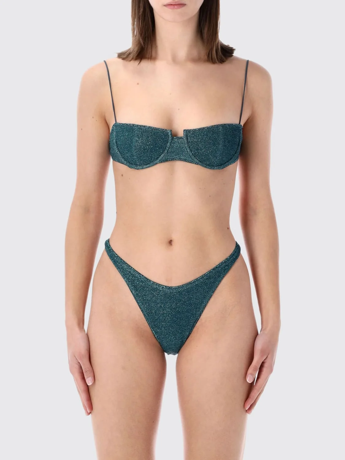 DESCRIPTION - Closure: With bands to tie - Waist: High - Bottom: With straight hemline - Model: Stretch - Materials: Lurex, Polyamide - Pattern: Plain-colored DETAILS AND CARE Composition 64% POLYAMIDE 36% METALLIC 80% POLYAMIDE 20% SIZE AND FIT Sizes not available Size and fit Slim fit Designer code: LBS261 PEACOCK Giglio Code: H94108 Designer: Oseree Collection: Oseree Woman Category: Clothing Oseree