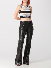 DESCRIPTION - Style: Contemporary, Urban-street - Pockets: Patch pocket with button - Bottom: With straight hemline - Closure: With button and zip - Waist: Low waist - Materials: Smooth leather - Pattern: Plain-colored DETAILS AND CARE Composition 100%LE SIZE AND FIT Sizes not available Size and fit Flared Designer code: PWJB013F23LEA001 1076 Giglio Code: E58882 Designer: Palm Angels Collection: Palm Angels Woman Category: Clothing Palm Angels