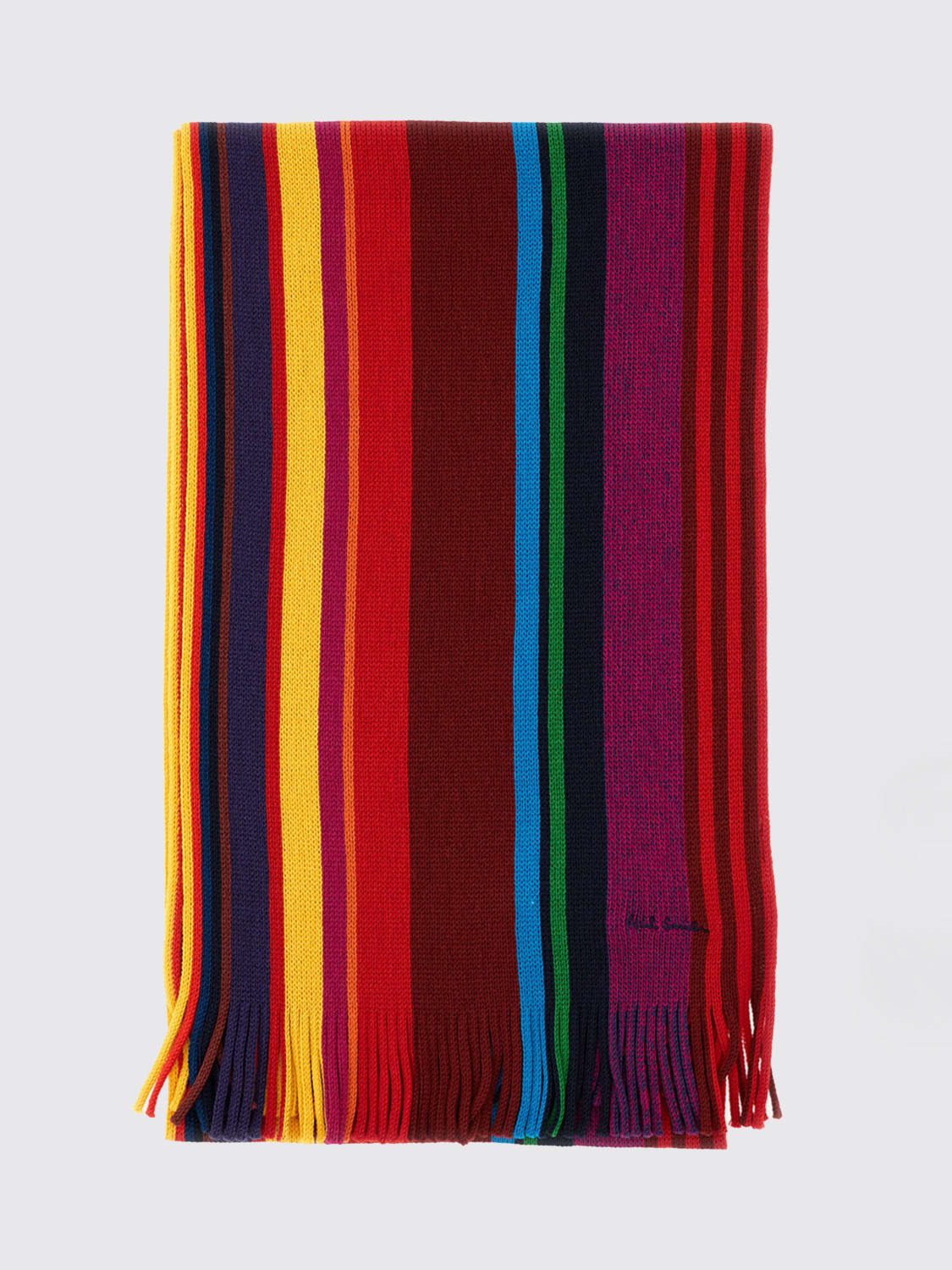 DESCRIPTION - Style: Pop - Logo: Embroidered - Bottom: Fringed - Shape: Rectangular - Occasion: Morning - Materials: Merino wool - Pattern: Multicolor stripes DETAILS AND CARE Composition 100% MERINO WOOL SIZE AND FIT Sizes not available Designer code: M1A151FT645 28 Giglio Code: H47891 Designer: Paul Smith Collection: Paul Smith Men Category: Accessories Paul Smith