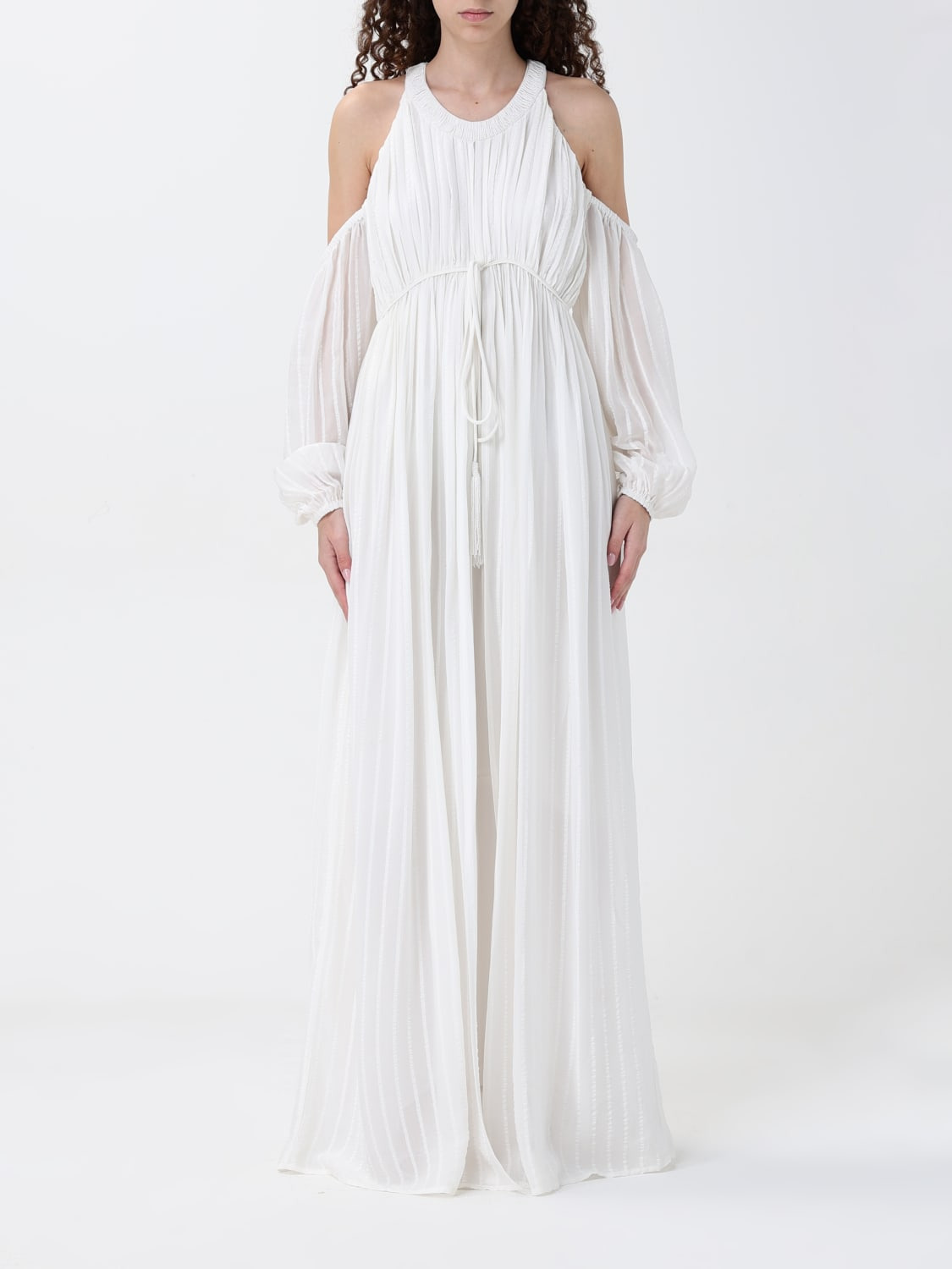 DESCRIPTION - Style: Casual - Model: Pleated - Neckline: Halter neck - Waist: With drawstrings - Bottom: With straight hemline - Length: Long dresses - Occasion: Ceremony and cocktail dresses, Evening and party dresses - Sleeves: Off-the-shoulder dresses - Materials: Viscose - Pattern: Plain-colored DETAILS AND CARE Composition 100% viscose SIZE AND FIT Sizes not available Size and fit Regular fit Designer code: 104848A2GY Z05 Giglio Code: G79172 Designer: Pinko Collection: Pinko Woman Category: Clothing Pinko