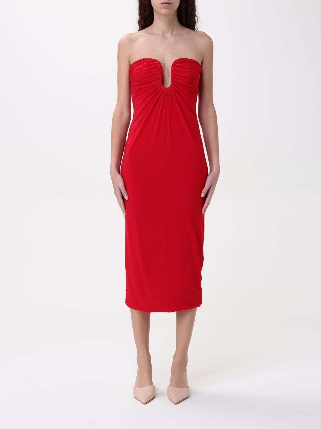 DESCRIPTION - Style: Elegant, Glamour - Occasion: Ceremony and cocktail dresses, Evening and party dresses - Length: Midi dresses - Neckline: Sweetheart teardrop neckline - Sleeves: Off-the-shoulder dresses - Closure: Back closure with zip - Bottom: With straight hemline - Materials: Viscose blend - Pattern: Plain-colored DETAILS AND CARE Composition 94% viscose, 6%elastane, 90% nylon, 10% elast SIZE AND FIT Sizes not available Size and fit Slim fit Designer code: 105021A2GS R49 Giglio Code: G49184 Designer: Pinko Collection: Pinko Woman Category: Clothing Pinko