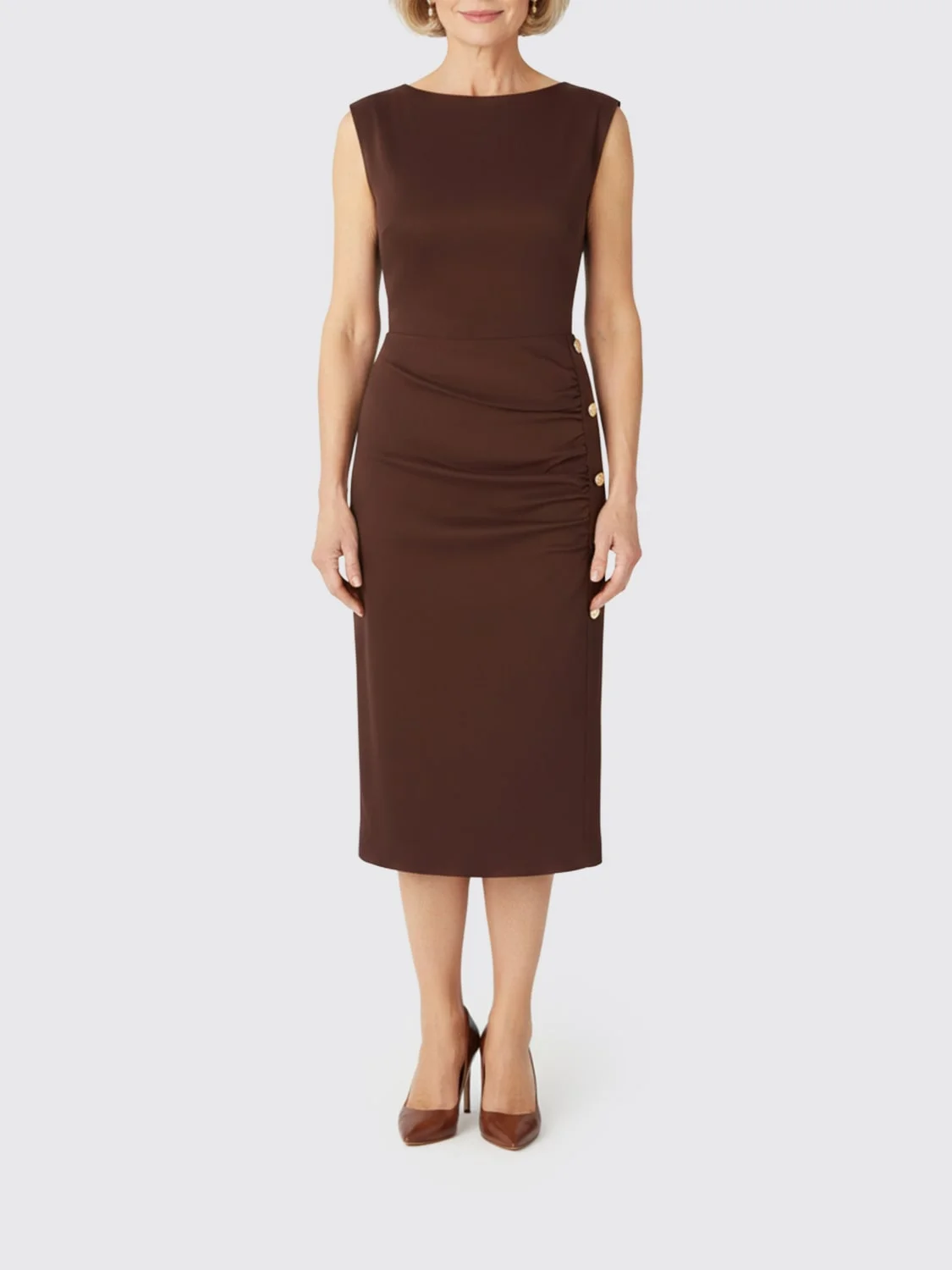 DESCRIPTION - Style: Classic - Details: With buttons - Model: Sheath - Shoulders: Regular - Closure: Back closure with zip - Bottom: With straight hemline - Neckline: Round - Length: Midi dresses - Occasion: Ceremony and cocktail dresses, Evening and party dresses - Sleeves: Sleeveless dresses - Materials: Linen blend - Pattern: Plain-colored DETAILS AND CARE Composition EST - Tessuto Esterno: 60%LI 35%VI 5%EA SIZE AND FIT Sizes not available Size and fit Slim fit Designer code: 106521A34I L78 Giglio Code: 441816 Designer: Pinko Collection: Clothing Pinko Category: Clothing > Dress