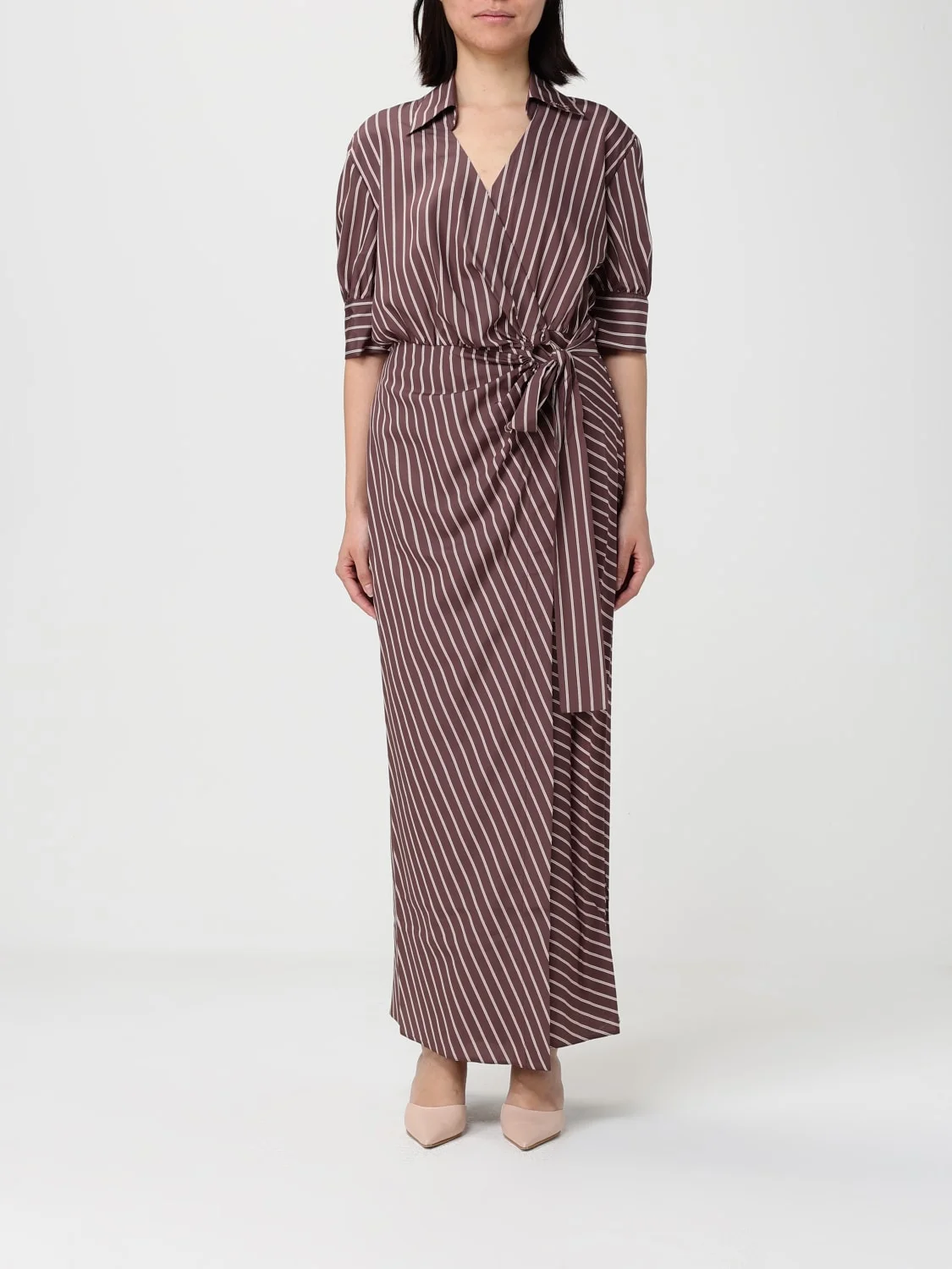 DESCRIPTION - Style: Casual - Model: Chemisier, Wrap-around - Neck: Classic - Neckline: V neckline - Shoulders: Regular - Closure: With bands to tie - Bottom: With straight hemline - Length: Long dresses - Occasion: Morning dresses - Sleeves: Short-sleeve dresses - Materials: Cotton - Pattern: Stripes DETAILS AND CARE Composition not available SIZE AND FIT Sizes not available Size and fit Regular fit Designer code: 106669A33Q LN1 Giglio Code: H97669 Designer: Pinko Collection: Clothing Pinko Category: Clothing > Dress