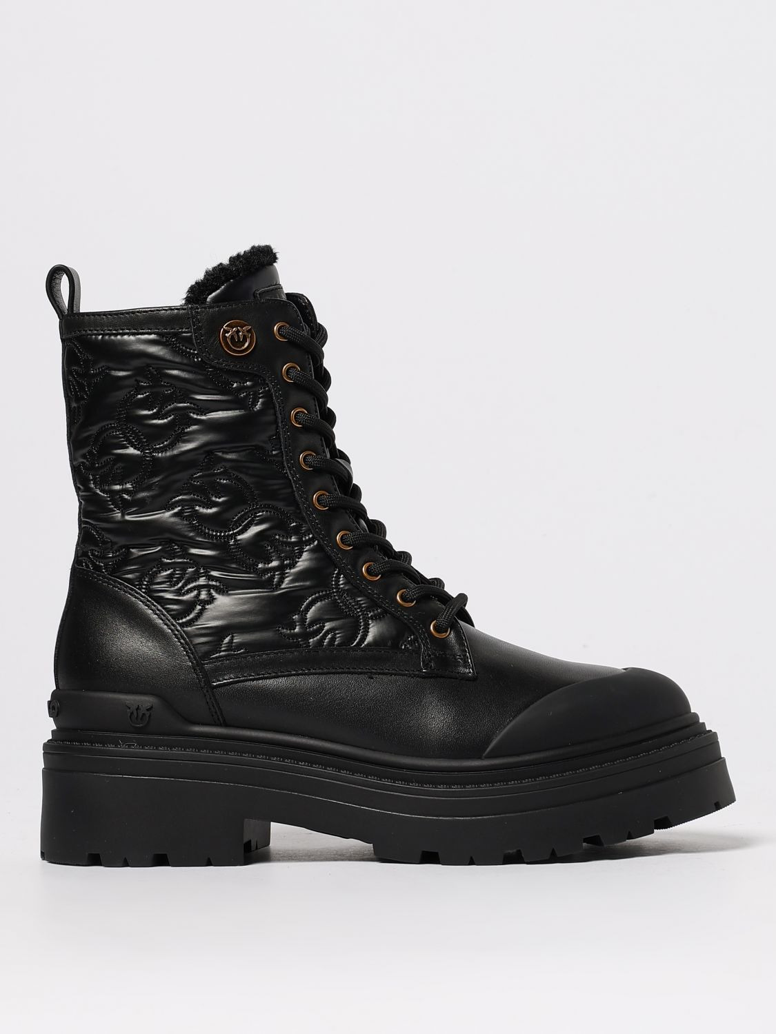 DESCRIPTION - Logo: Love Birds - Details: With back tab - Model: Combat boots - Closure: Side closure with zip - Toe: Rubber - Shaft: Low - Sole: Rubber - Heel: Low heel - Lining: Shearling - Materials: Smooth calfskin - Pattern: Monogram DETAILS AND CARE Composition 100% calf leather/rubber sole SIZE AND FIT Sizes not available Designer code: SD0401T035 Z99 Giglio Code: H36558 Designer: Pinko Collection: Pinko Woman Category: Shoes Pinko