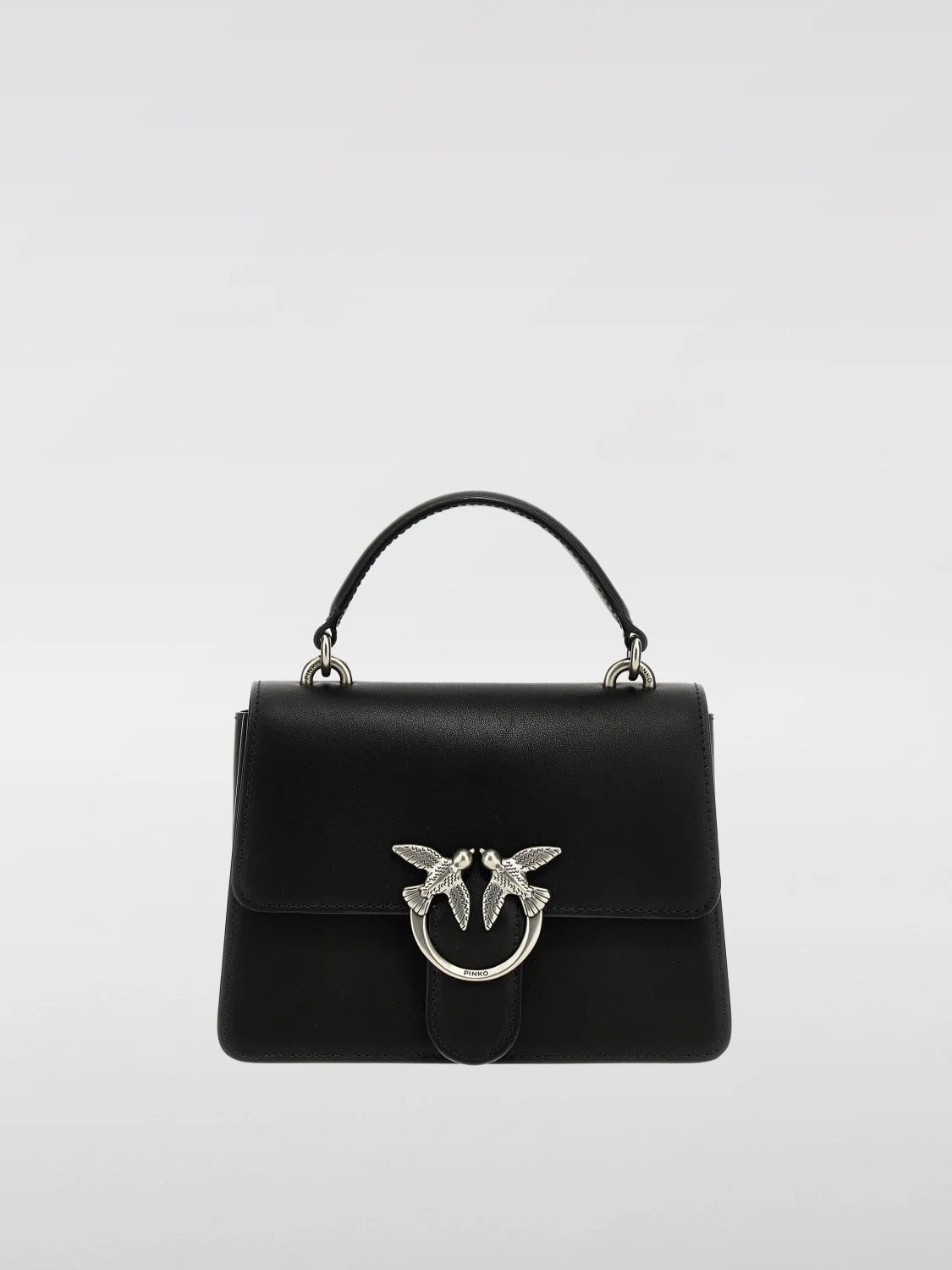 DESCRIPTION - Logo: Metallic, Pinko Love Birds - Model: Hand - Closure: With button flap - Shape: Flared - Shoulder strap: Adjustable and removable - Handle: Leather - Materials: Smooth leather - Pattern: Logo, Plain-colored DETAILS AND CARE Composition 100% CALF LEATHER SIZE AND FIT Sizes Width : 21 cm Height: 15 cm Depth: 7 cm Designer code: 100071A0F1 Z99O Giglio Code: G49168 Designer: Pinko Collection: Pinko Woman Category: Bags Pinko