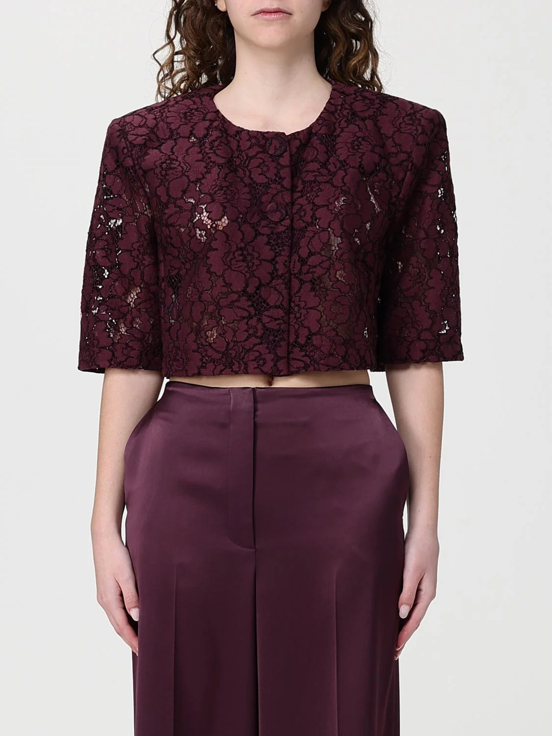 DESCRIPTION - Style: Romantic - Occasion: Ceremony and cocktail, Evening and party - Model: Crewneck - Neckline: Crewneck - Shoulders: Regular - Sleeves: Short - Closure: With buttons - Bottom: With straight hemline - Length: Short jackets - Materials: Lace - Pattern: Plain-colored DETAILS AND CARE Composition not available SIZE AND FIT Sizes not available Size and fit Cropped fita Designer code: 106552A330 R57 Giglio Code: I08019 Designer: Pinko Collection: Clothing Pinko Category: Clothing > Jacket