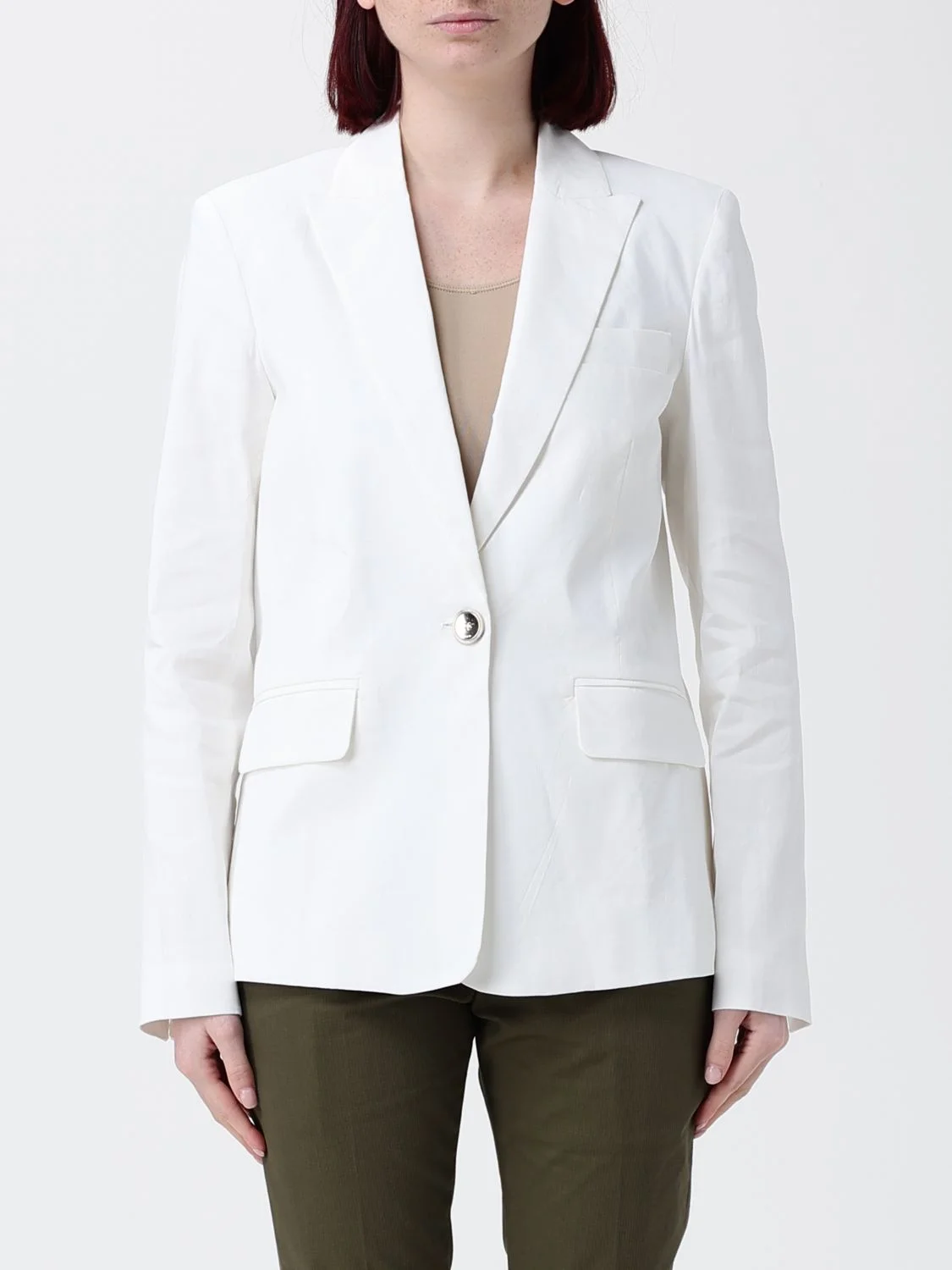 DESCRIPTION - Style: Classic, Elegant - Model: Single-breasted - Shoulders: Regular - Sleeves: Long - Bottom: With back slit, With straight hemline - Neck: Lapel - Pockets: With flap - Closure: 1-button - Length: Short jackets - Materials: Linen blend - Pattern: Plain-colored DETAILS AND CARE Composition 60%LI 35%VI 5%EA SIZE AND FIT Sizes not available Size and fit Regular fit Designer code: 106597A34I Z05 Giglio Code: I19580 Designer: Pinko Collection: Clothing Pinko Category: Clothing > Jacket