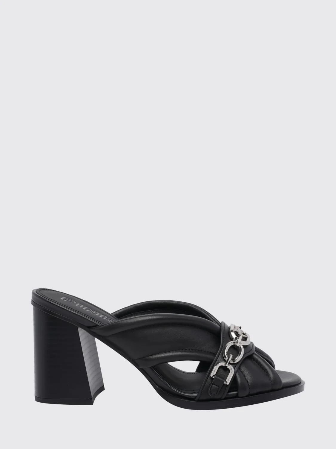 DESCRIPTION - Style: Contemporary - Logo: Metallic, Pinko Love Birds - Model: Slip on - Toe: Open, Round - Sole: Rubber - Lining: With logo - Occasion: Morning - Heel: Tacco alto quadrato - Materials: Smooth calfskin - Pattern: Plain-colored DETAILS AND CARE Composition 100% calf leather/rubber sole SIZE AND FIT Sizes Heel: 8,5 cm Designer code: SD0505P003 Z99 Giglio Code: I09710 Designer: Pinko Collection: Shoes Pinko Category: Shoes > Heeled sandal
