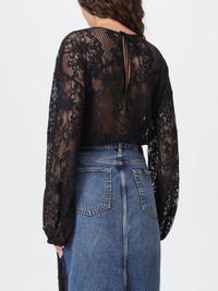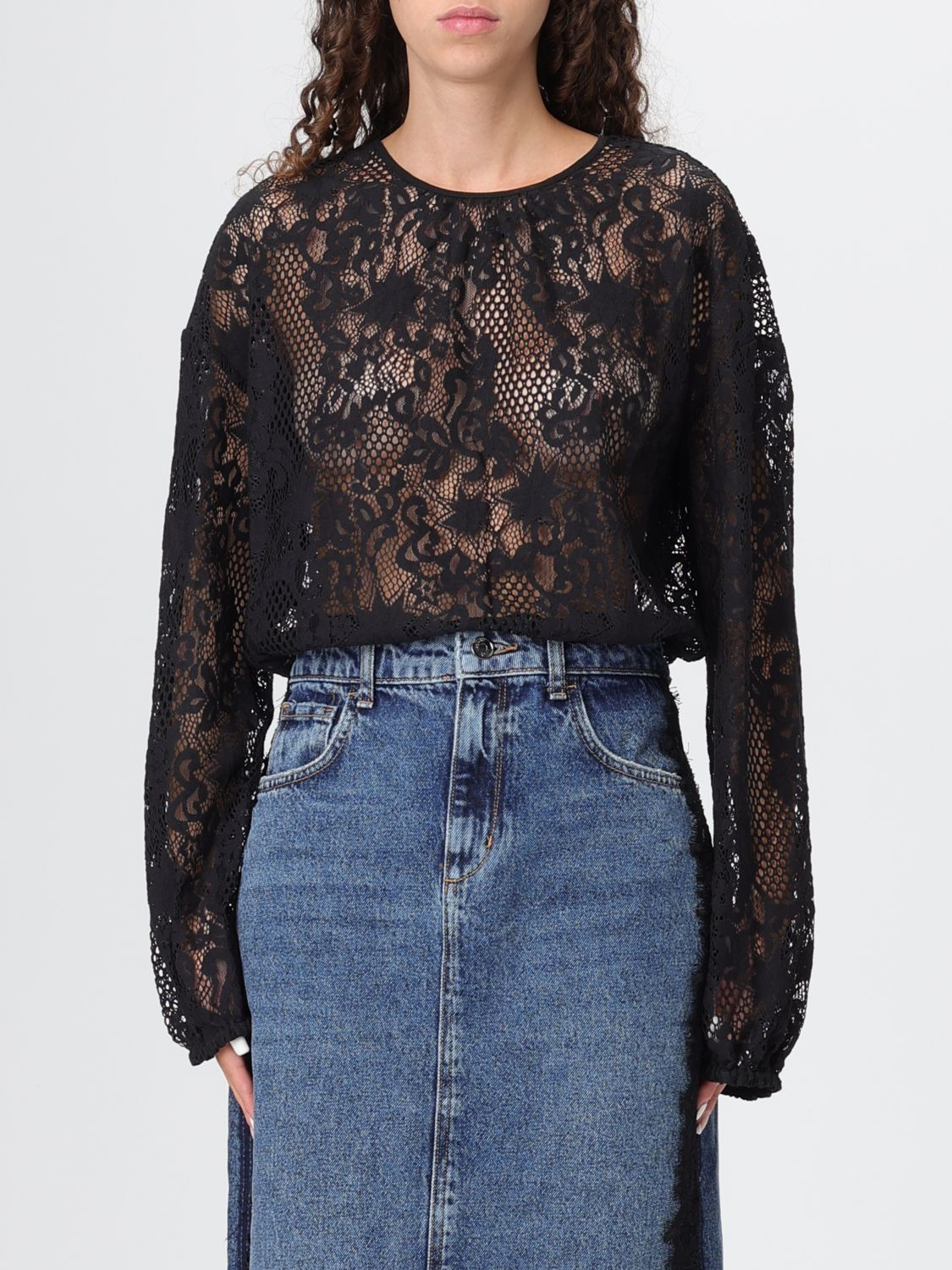 DESCRIPTION - Style: Romantic - Neckline: Crewneck - Shoulders: Relaxed - Closure: With snap buttons on the bottom - Bottom: With straight hemline - Sleeves: Long sleeve tops - Materials: Lace - Pattern: Plain-colored DETAILS AND CARE Composition not available SIZE AND FIT Sizes not available Size and fit Relaxed fit Designer code: 105471A2QB Z99 Giglio Code: H27810 Designer: Pinko Collection: Pinko Woman Category: Clothing Pinko