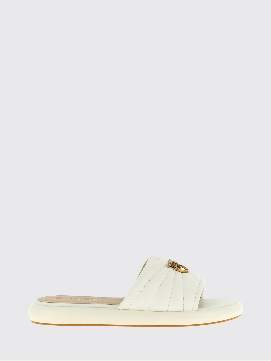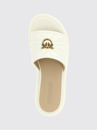 DESCRIPTION - Style: Casual - Logo: Metallic, Pinko Love Birds - Lining: Leather, With logo - Model: Slippers - Toe: Open, Round - Sole: Rubber - Heel: Low heel - Occasion: Morning - Materials: Matelasse Nappa leather, Nappa sheepskin - Pattern: Monogram DETAILS AND CARE Composition UPPER: 100% OVIS ARIES ARIES; SIZE AND FIT Sizes not available Designer code: SD0525P003 Z12 Giglio Code: 441860 Designer: Pinko Collection: Pinko Woman Category: Shoes Pinko