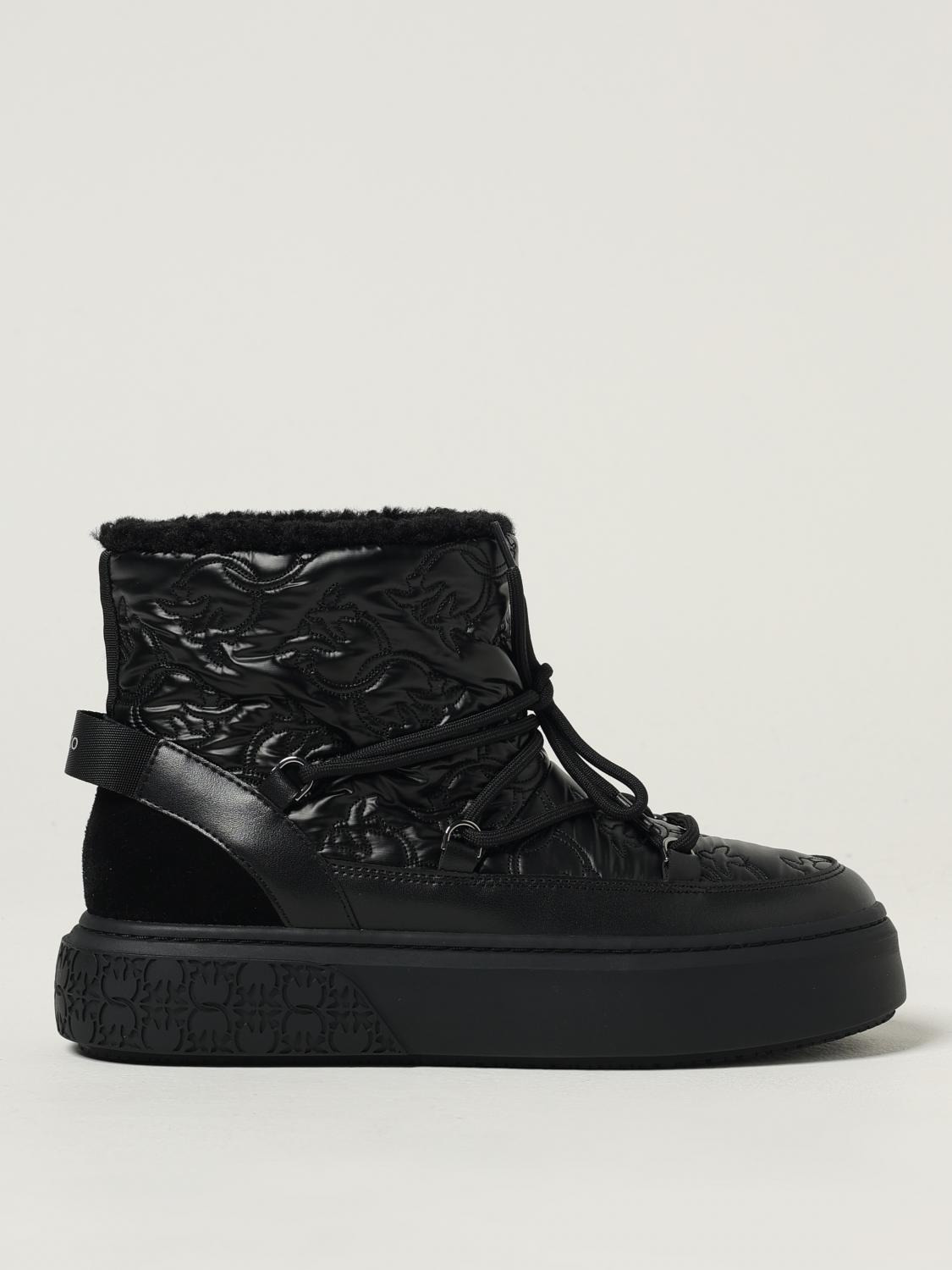 DESCRIPTION - Logo: Love Birds - Details: With back tab - Model: Snow - Closure: With bands to tie - Toe: Round - Shaft: Low - Sole: Rubber - Heel: Low heel - Lining: Shearling - Materials: Smooth leather - Pattern: Logo DETAILS AND CARE Composition 73% PL (POLYESTER) 15% BOS TAURUS (COW) SIZE AND FIT Sizes not available Designer code: SS0101T036 Z99 Giglio Code: 430448 Designer: Pinko Collection: Pinko Woman Category: Shoes Pinko