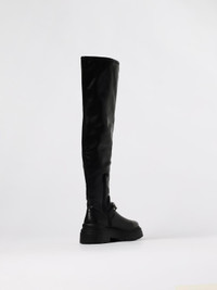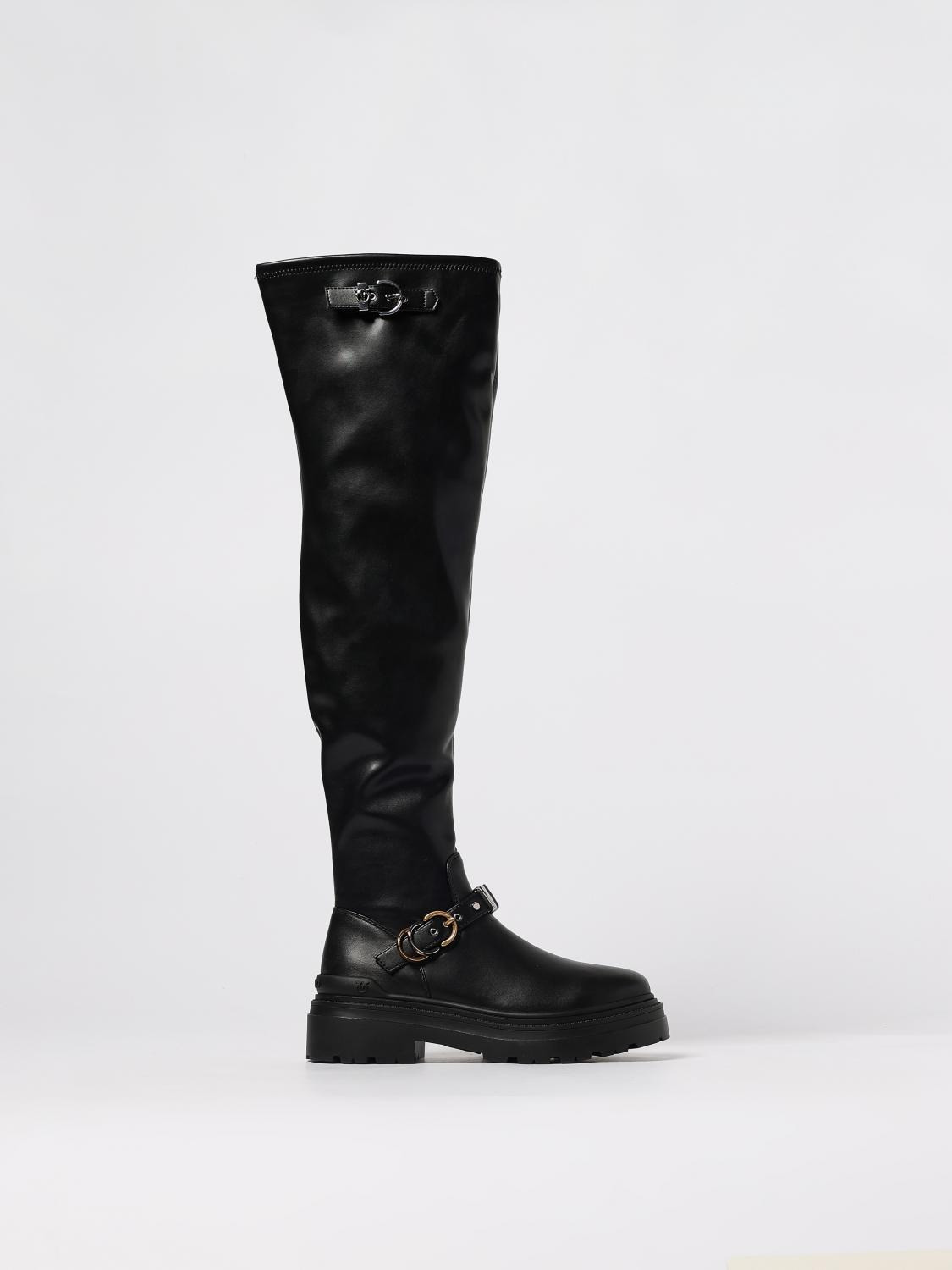 DESCRIPTION - Logo: Love Birds - Details: With buckle - Lining: With logo - Model: Thigh high boots - Closure: Side closure with zip - Toe: Round - Shaft: Over-the-knee - Sole: Rubber - Heel: Low heel - Materials: Smooth leather - Pattern: Plain-colored DETAILS AND CARE Composition 74% POLYURETHANE 26% COW LEATHER SIZE AND FIT Sizes not available Designer code: SD0445E028 Z99 Giglio Code: H28511 Designer: Pinko Collection: Pinko Woman Category: Shoes Pinko