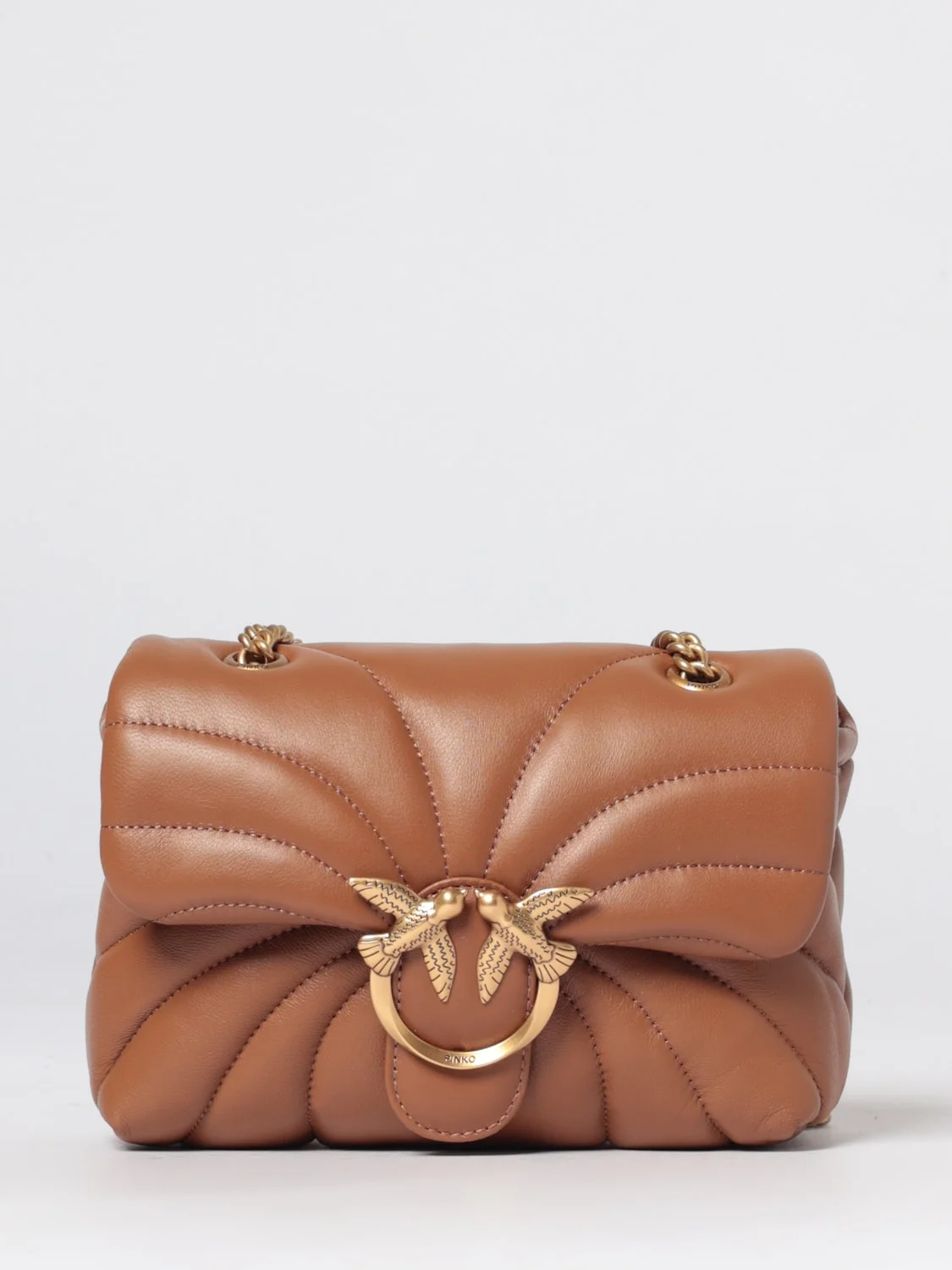 DESCRIPTION - Style: Casual - Logo: Metallic, Pinko Love Birds - Lining: With 2 compartments, With zipped partition - Model: Shoulder - Closure: With button flap - Shape: Rectangular - Shoulder strap: With leather shoulder rests - Occasion: Morning - Materials: Matelasse Nappa leather - Pattern: Monogram DETAILS AND CARE Composition PEL - Pelle: 100%HD - INT - Interno: 10 SIZE AND FIT Sizes Width : 21 cm Height: 15 cm Depth: 9 cm Designer code: 100039A1EX L17Q Giglio Code: 441782 Designer: Pinko Collection: Pinko Woman Category: Bags Pinko
