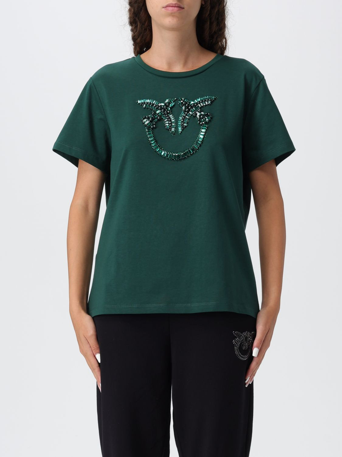 DESCRIPTION - Style: Sporty - Occasion: Morning - Logo: Rhinestone - Neckline: Crewneck - Shoulders: Regular - Sleeves: Short - Bottom: With straight hemline - Materials: Cotton - Pattern: undefined DETAILS AND CARE Composition not available SIZE AND FIT Sizes not available Size and fit Regular fit Designer code: 100535A2RN X79 Giglio Code: H28064 Designer: Pinko Collection: Pinko Woman Category: Clothing Pinko