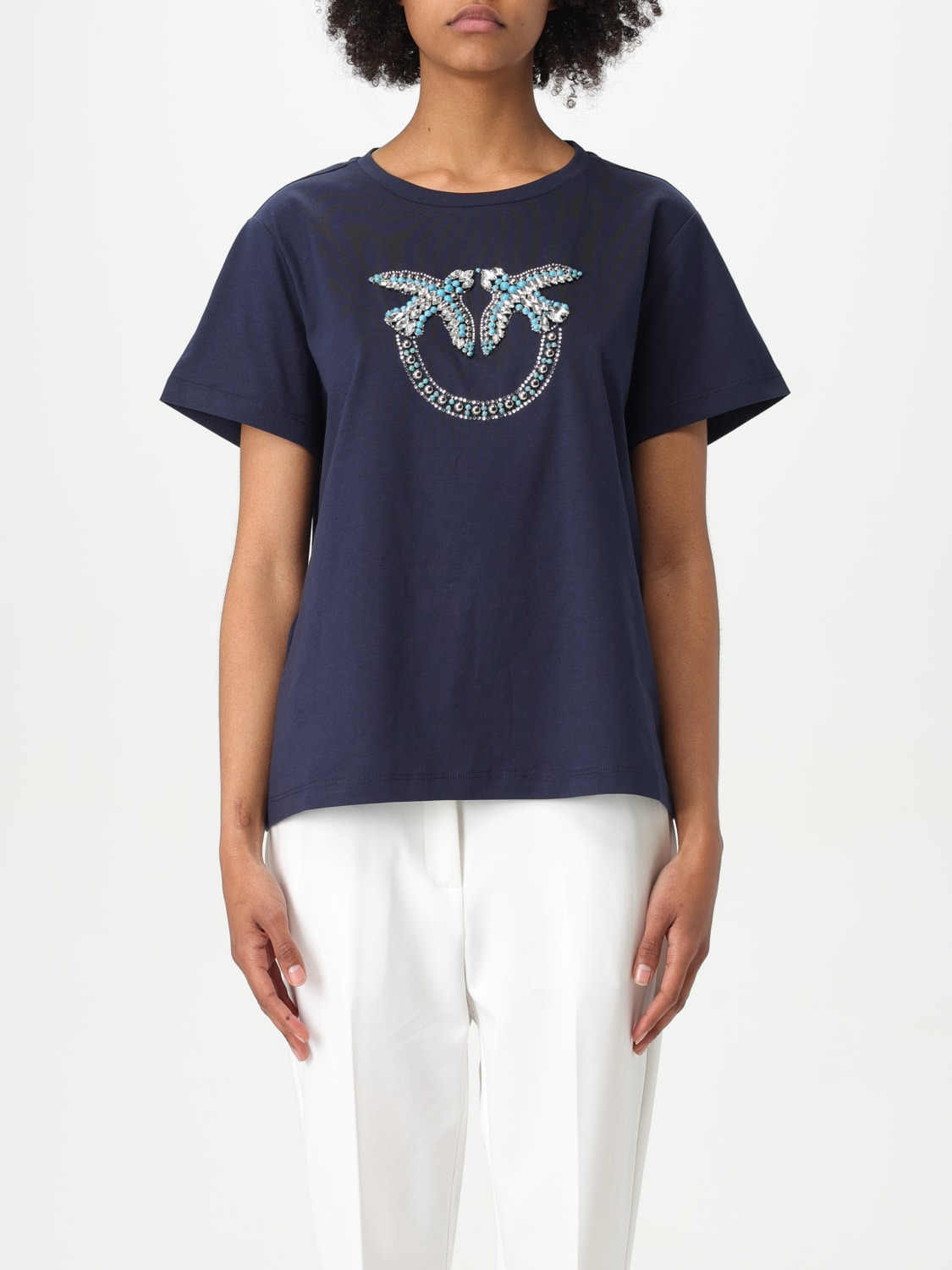 DESCRIPTION - Style: Sporty - Logo: Love Birds - Model: Crewneck - Neckline: Crewneck - Shoulders: Regular - Sleeves: Short - Bottom: With straight hemline - Materials: Cotton - Pattern: Logo DETAILS AND CARE Composition EST - Tessuto Esterno: 100%CO - ES1 - 1 SIZE AND FIT Sizes not available Size and fit Slim fit Designer code: 100535A2G7 G1A Giglio Code: 425453 Designer: Pinko Collection: Pinko Woman Category: Clothing Pinko