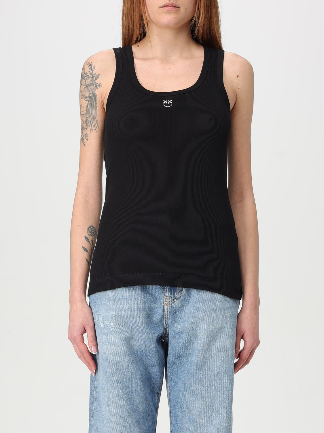 DESCRIPTION - Logo: Contrasting - Neckline: U neckline - Shoulders: Regular - Sleeves: Sleeveless - Bottom: With straight hemline - Model: Stretch - Materials: Cotton - Pattern: Plain-colored DETAILS AND CARE Composition 97% cotton, 3%elastane SIZE AND FIT Sizes not available Size and fit Slim fit Designer code: 100807A2C1 Z99 Giglio Code: G49177 Designer: Pinko Collection: Pinko Woman Category: Clothing Pinko