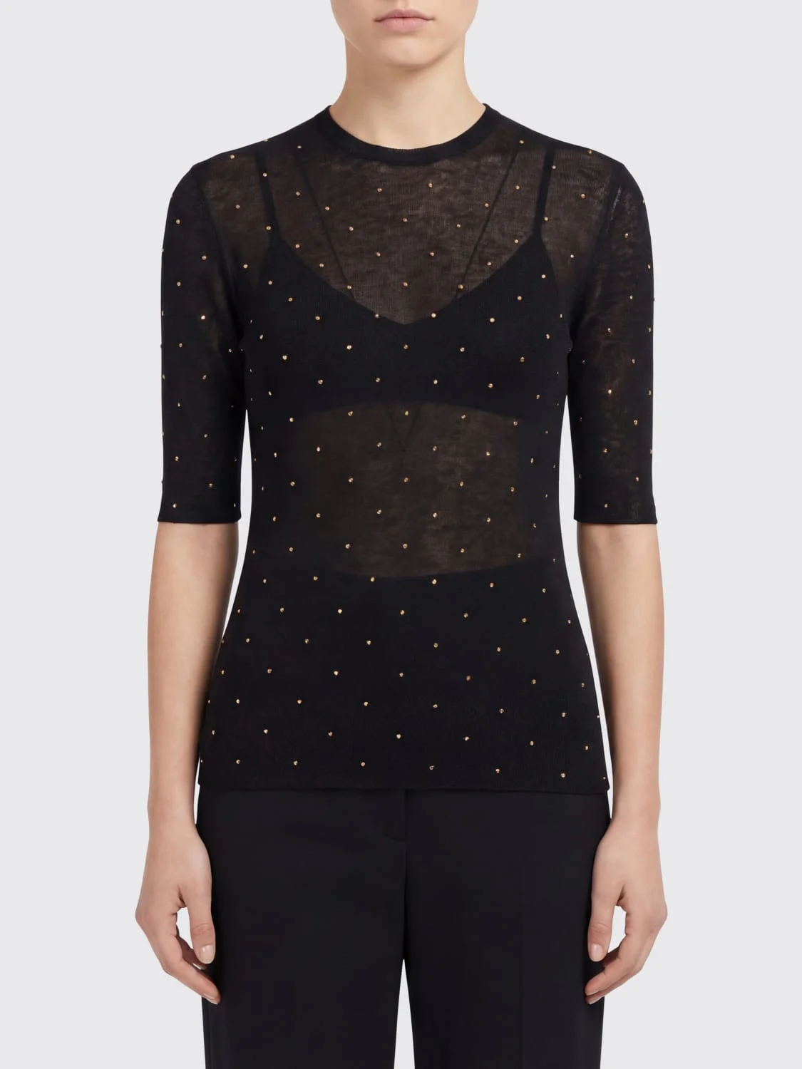 DESCRIPTION - Style: Glamour - Details: With studs - Neckline: Crewneck - Shoulders: Regular - Bottom: With straight hemline - Sleeves: Short sleeve tops - Materials: Viscose - Pattern: Embroidery, Plain-colored DETAILS AND CARE Composition Viscose | 97%VI03%EA SIZE AND FIT Sizes not available Size and fit Slim fit Designer code: 26PMTO186ML0336 P001 Giglio Code: I03326 Designer: Rabanne Collection: Clothing Rabanne Category: Clothing > Top