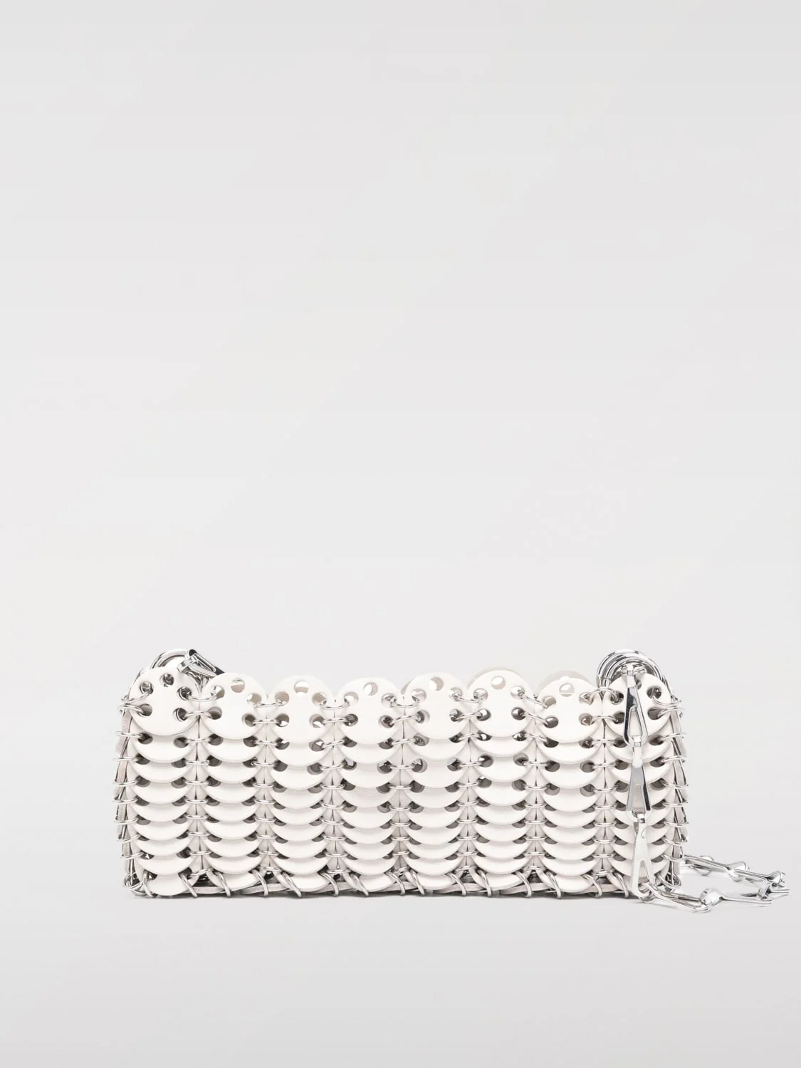 DESCRIPTION - Style: Punk - Model: Shoulder - Closure: Magnetic - Shape: Rectangular - Shoulder strap: Metal mesh - Materials: Calfskin - Pattern: Plain-colored DETAILS AND CARE Composition Leather | 100% COW LEATHER SIZE AND FIT Sizes Width : 19 cm Height: 9 cm Depth: 2 cm Designer code: 25PSS0127CLF226 M124 Giglio Code: G51720 Designer: Rabanne Collection: Rabanne Woman Category: Bags Rabanne