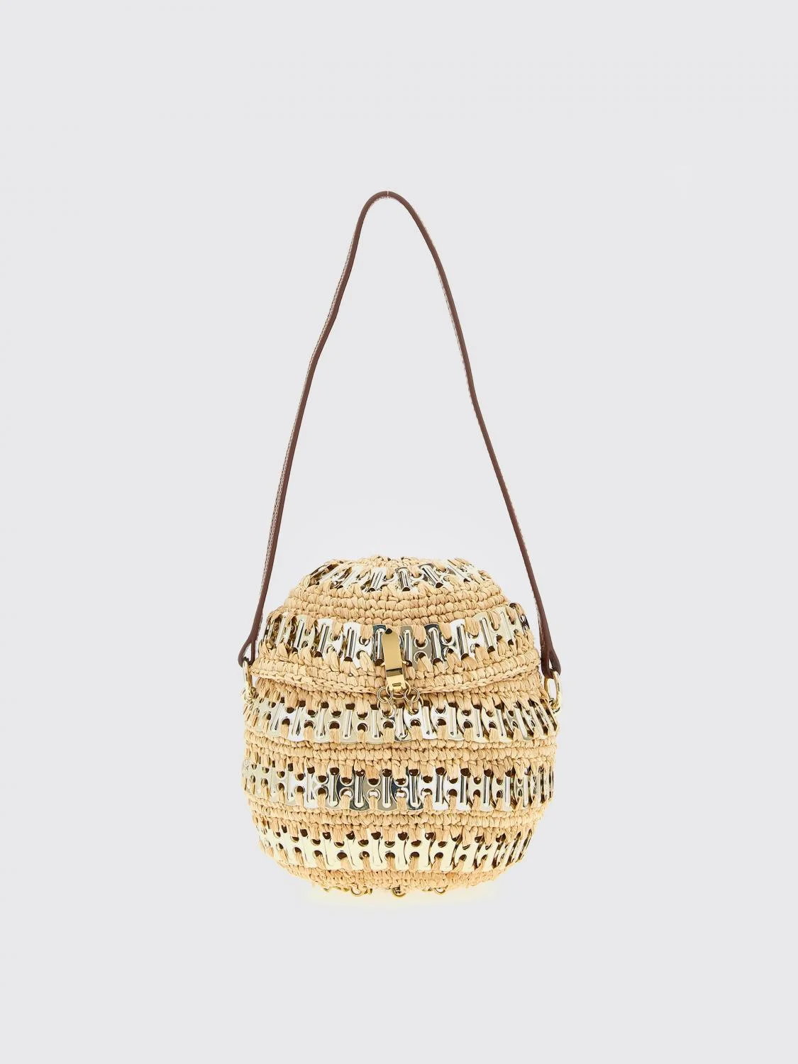 DESCRIPTION - Style: Vintage - Logo: Engraved - Lining: Unlined - Model: Shoulder - Closure: With snap metal mechanism - Shape: Round - Shoulder strap: Leather - Details: With metallic ring - Materials: Brass - Pattern: undefined DETAILS AND CARE Composition 60% raffia 30% calfleather 10% brass SIZE AND FIT Sizes not available Designer code: 25ASS0474NAT060 M227 Giglio Code: H31599 Designer: Rabanne Collection: Rabanne Woman Category: Bags Rabanne