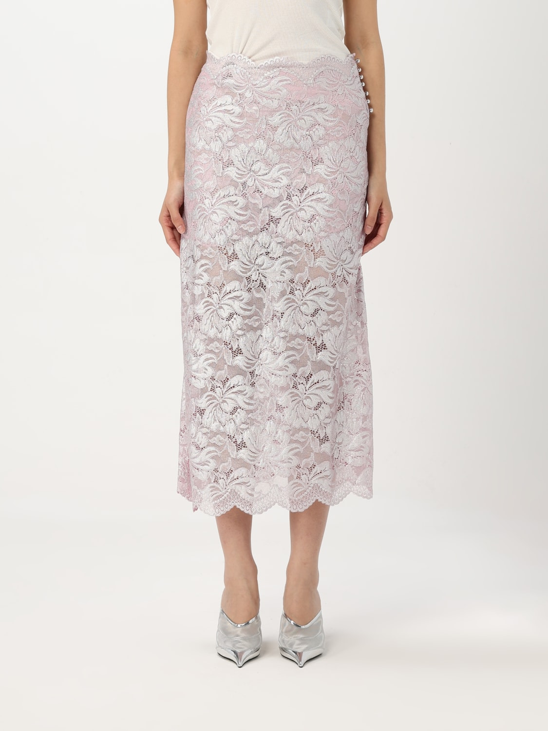 DESCRIPTION - Style: Romantic - Closure: Side closure with buttons - Waist: High - Bottom: Weaved - Length: Midi skirts - Materials: Lace - Pattern: Plain-colored DETAILS AND CARE Composition not available SIZE AND FIT Sizes not available Size and fit Regular fit Designer code: EJJU598PA0244 M959 Giglio Code: G81572 Designer: Rabanne Collection: Rabanne Woman Category: Clothing Rabanne