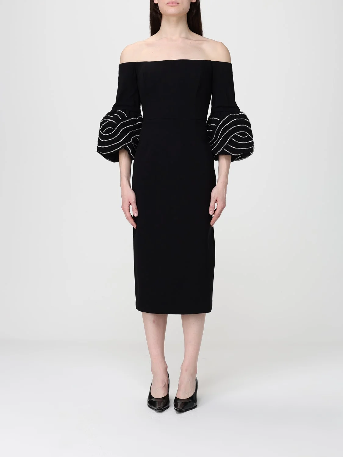 DESCRIPTION - Style: Chic, Elegant - Details: With rhinestones - Neckline: Crewneck - Shoulders: Regular - Closure: Back closure with zip - Bottom: With back slit, With straight hemline - Cuffs: Flared - Length: Midi dresses - Occasion: Ceremony and cocktail dresses, Evening and party dresses - Sleeves: Short-sleeve dresses - Materials: Crepe - Pattern: Embroidery, Plain-colored DETAILS AND CARE Composition not available SIZE AND FIT Sizes not available Size and fit Slim fit Designer code: 25041274 BLACK Giglio Code: I09225 Designer: Rebecca Vallance Collection: Clothing Rebecca Vallance Category: Clothing > Dress
